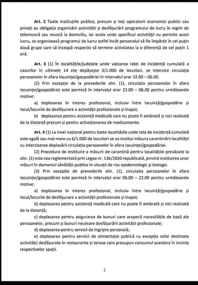 Art. 2 Toate instituțiile publice, precum și toți operatorii economici publici sau privați au obligația organizării activității și desfășurării programului de lucru în regim de telemuncă sau muncă la domiciliu, iar acolo unde specificul activității nu permite acest lucru, se organizează programul de lucru astfel încât personalul să fie împărțit în cel puțin două grupe care să înceapă respectiv să termine activitatea la o diferență de cel puțin 1 oră.