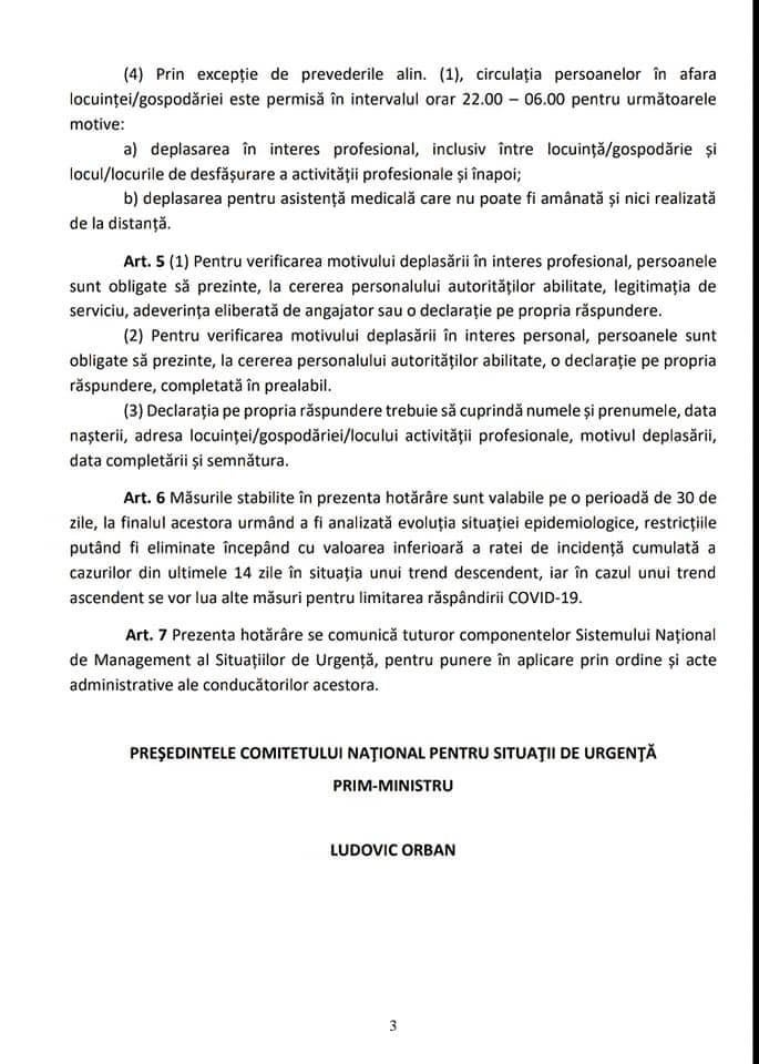 Art. 3 (1) În localitățile/județele unde valoarea ratei de incidență cumulată a cazurilor în ultimele 14 zile depășește 3/1.000 de locuitori, se interzice circulația persoanelor în afara locuinței/gospodăriei în intervalul orar 22.00 – 06.00.