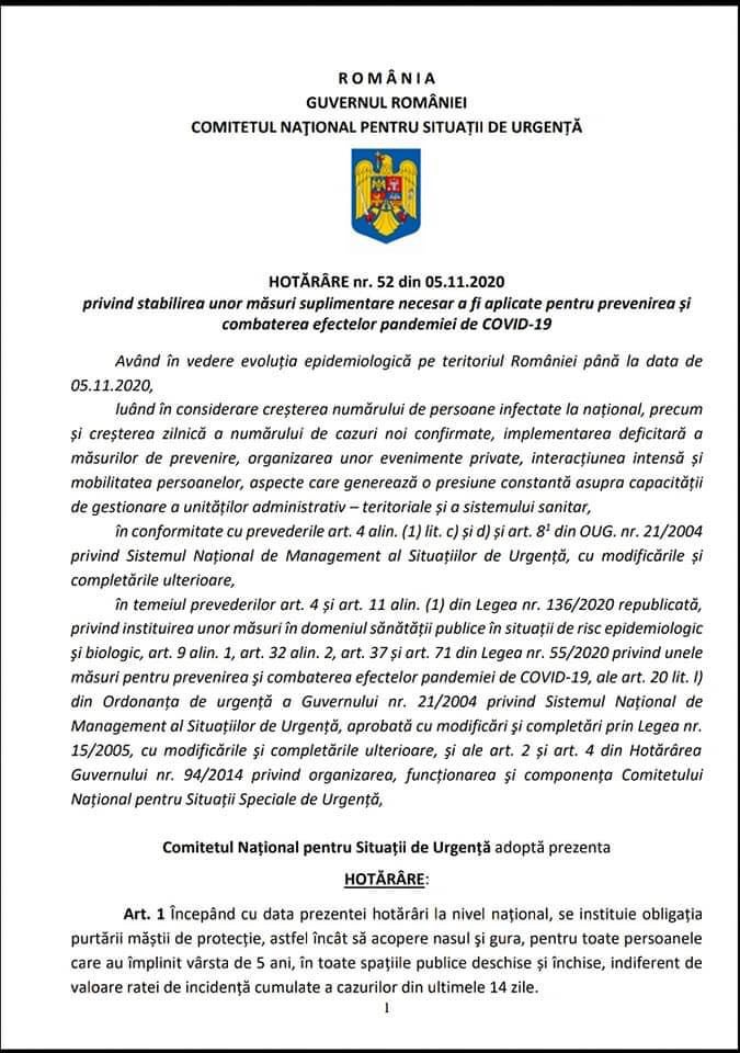 Art. 1 Începând cu data prezentei hotărâri la nivel național, se instituie obligația purtării măștii de protecție, astfel încât să acopere nasul şi gura, pentru toate persoanele care au împlinit vârsta de 5 ani, în toate spațiile publice deschise și închise, indiferent de valoare ratei de incidență cumulate a cazurilor din ultimele 14 zile.