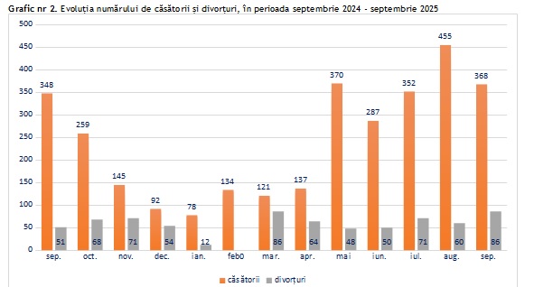 Pe lângă evoluțiile naturale, datele statistice includ și informații privind nupţialitatea și divorţialitatea. Oficiile de stare civilă din judeţ au oficiat 368 de căsătorii în luna septembrie 2025. Numărul este în scădere cu 87 față de luna august, dar în creștere cu 20 comparativ cu septembrie 2024, confirmând o tendință anuală ascendentă în rândul celor care aleg să se căsătorească.