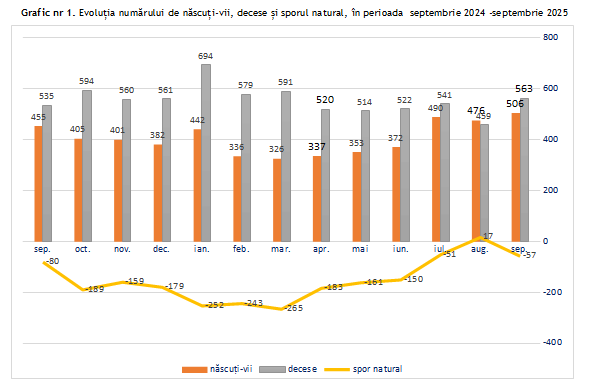 În paralel însă, numărul deceselor a crescut semnificativ. În septembrie 2025 au murit 563 de persoane, cu 104 mai multe decât în luna precedentă și cu 28 peste nivelul raportat în septembrie 2024. Evoluția înregistrează cea mai ridicată valoare lunară a deceselor din ultimele trei luni, potrivit statisticilor provizorii.