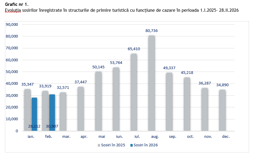 În februarie 2026, structurile de primire turistică din județul Bihor au înregistrat 30.907 sosiri. Față de ianuarie 2026, acest indicator a crescut cu 9,9%, semnalând o revenire a activității turistice după începutul de an. Totuși, comparativ cu februarie 2025, numărul sosirilor a scăzut cu 8,9%, ceea ce indică o contracție anuală a fluxului turistic.