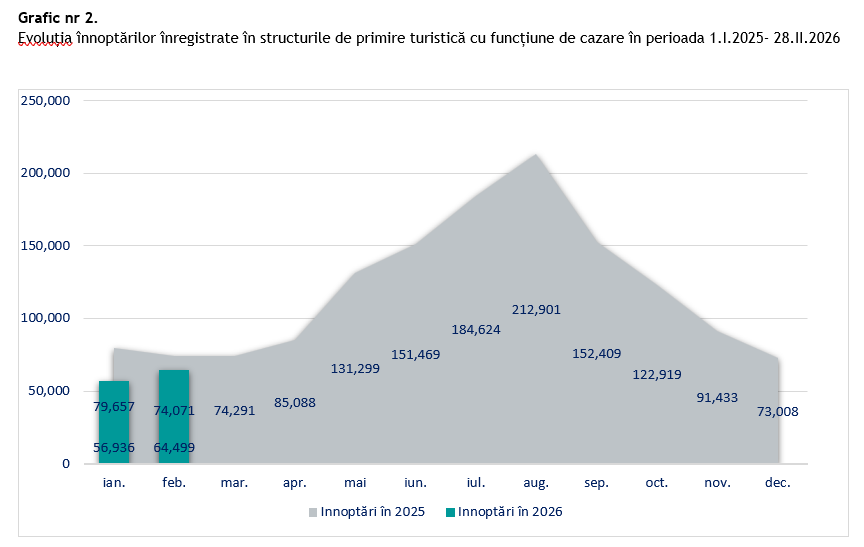 În ceea ce privește înnoptările, februarie 2026 a adus un total de 64.499 de nopți de cazare înregistrate în județ. Acest indicator a crescut cu 13,3% față de ianuarie 2026, însă a fost cu 12,9% mai mic decât în februarie 2025.