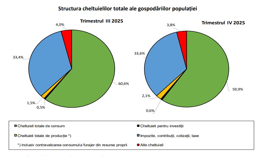 Cheltuielile totale ale unei familii s-au ridicat la 8.075 lei lunar, adică peste 85% din venituri. Din această sumă, aproximativ 2.711 lei au fost direcționați către stat, reprezentând 33,6% din totalul cheltuielilor. Consumul rămâne principala destinație a banilor, cu aproape 4.834 lei lunar, adică 59,9% din buget, mai arată datele publicate de INS.