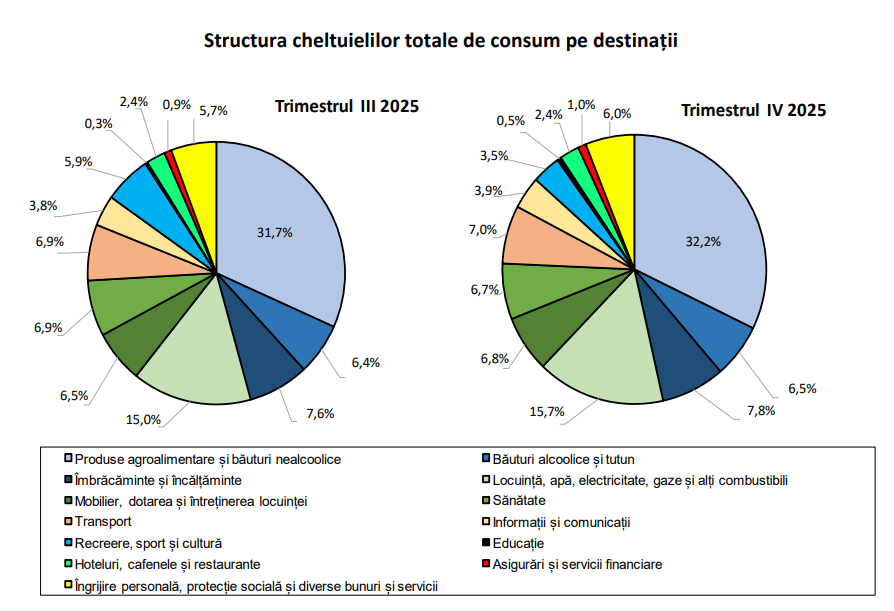 Privind mai atent structura consumului, datele INS arată că cea mai mare parte a cheltuielilor merge către produse alimentare și băuturi nealcoolice, aproximativ 1.555 lei pe lună, echivalentul a peste 32% din consum. Pe locul al doilea se află costurile cu locuința – utilități, energie și combustibili – care ajung la circa 761 lei lunar (15,7%). Cheltuielile pentru îmbrăcăminte și încălțăminte se ridică la 379 lei (7,8%), iar transportul consumă în jur de 339 lei (7%).