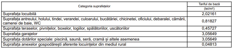 Noua grilă de tarifare introduce o structură detaliată în funcție de destinația fiecărei suprafețe locative. Spațiul principal de locuit este evaluat la aproximativ 2 lei/mp, în timp ce încăperile auxiliare – precum bucătării, băi, holuri sau debarale – sunt încadrate la un nivel mai redus, de aproximativ 0,81 lei/mp.