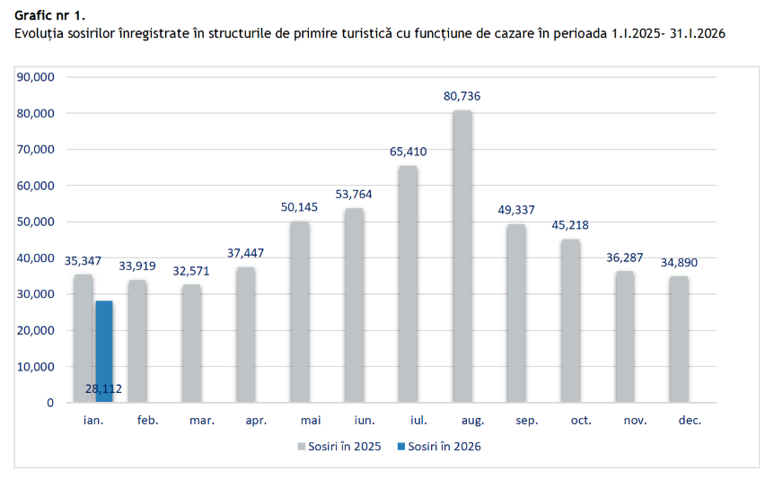 În prima lună a anului, sosirile în structurile de primire turistică au totalizat 28.112 persoane. Cifra este în scădere cu 19,4% față de luna decembrie 2025 și cu 20,5% comparativ cu ianuarie 2025, confirmând un recul consistent al fluxului turistic.