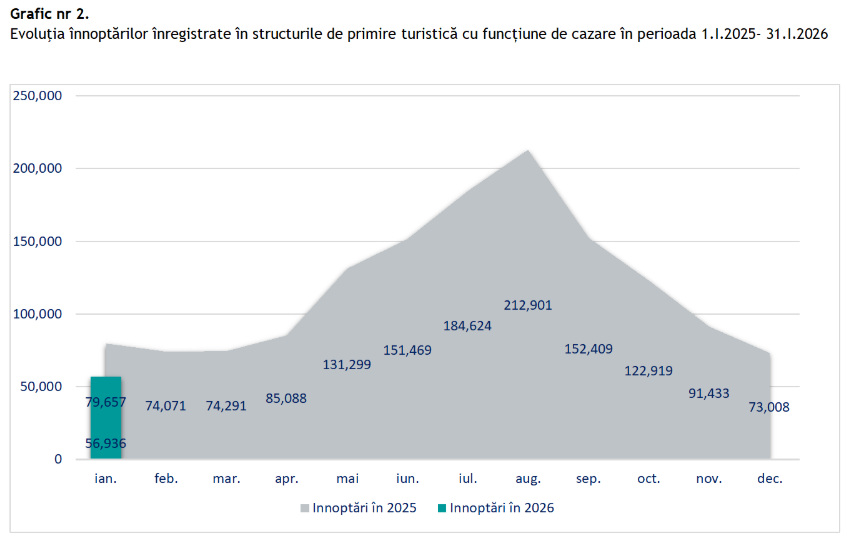 Și înnoptările au urmat același trend descendent. În ianuarie 2026 s-au înregistrat 56.936 de înnoptări, cu 28,5% mai puține față de aceeași lună a anului trecut și cu 22,0% sub nivelul din decembrie 2025. Scăderea indică nu doar un număr mai mic de turiști, ci și o reducere a duratei sejururilor.