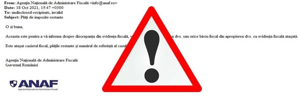 „Precizăm că ANAF nu are deschisă adresa de email: INFO@ANAF.RO. Persoanelor juridice, dar și celor fizice, care recepționează aceste mesaje, în care sunt informate despre discrepanțe în evidența fiscală, le recomandăm SĂ NU DESCHIDĂ MESAJELE ȘI NICI ATAȘAMENTELE acestora”, se menționează în comunicatul ANAF.
