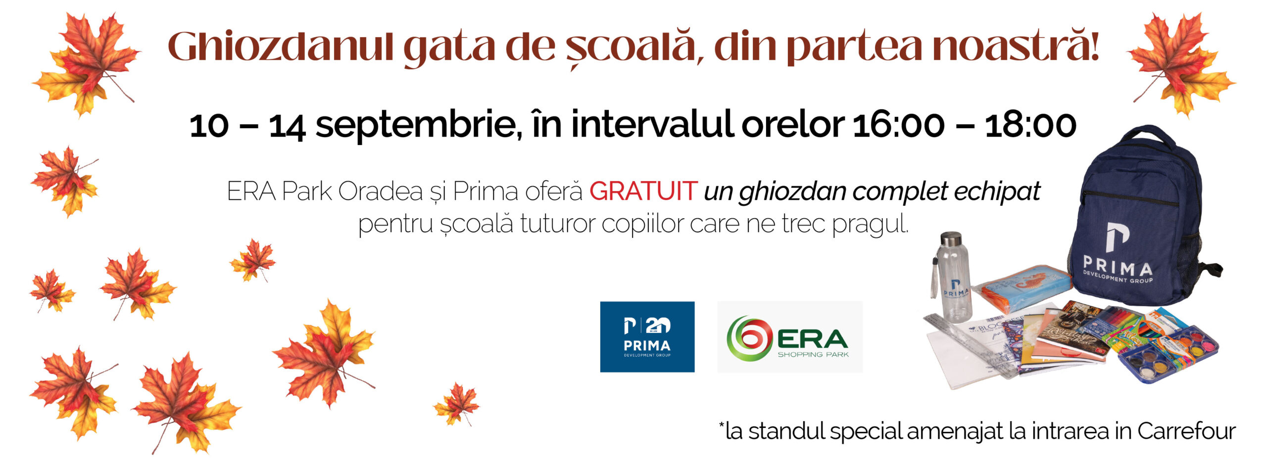 Tot ce trebuie să faci este să vii la ERA, la standul special amenajat la intrarea in Carrefour, în intervalul menționat, iar noi îți oferim ghiozdanul, în limita stocului disponibil.