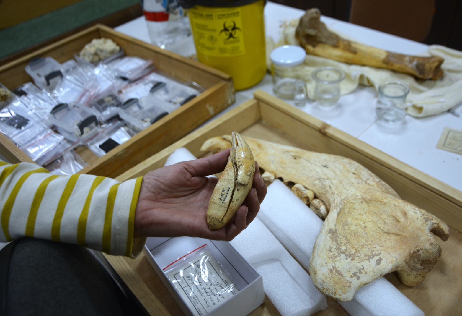 Pe masă, Erika mai are şi un humerus de Ursus spelaeus (ursul de peşteră) şi un canin colectat în 1955. Ce se colectează din peşteri vine dintr-un mediu foarte umed, de cele mai multe ori într-o argilă spalată de apă sau în nisip, spune restauratorul. Umiditatea pătrunde în structura osoasă foarte mult. În şantierele în care se colectează foarte multe oase se poate întâmpla ca timpul de uscare să nu fie adecvat sau soluţia de impregnare să fie prea concentrată, şi atunci, în timp, apar diverse probleme: îmbătrânire şi exfoliere a soluţiei, care presupun o restaurare complexă prin înlăturarea şelacului, dizolvarea în interior, apoi reconstruirea osului şi reimpregnare.