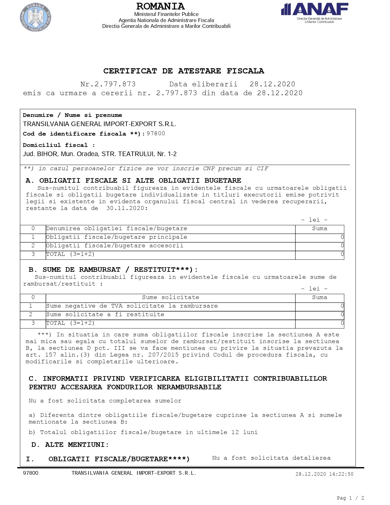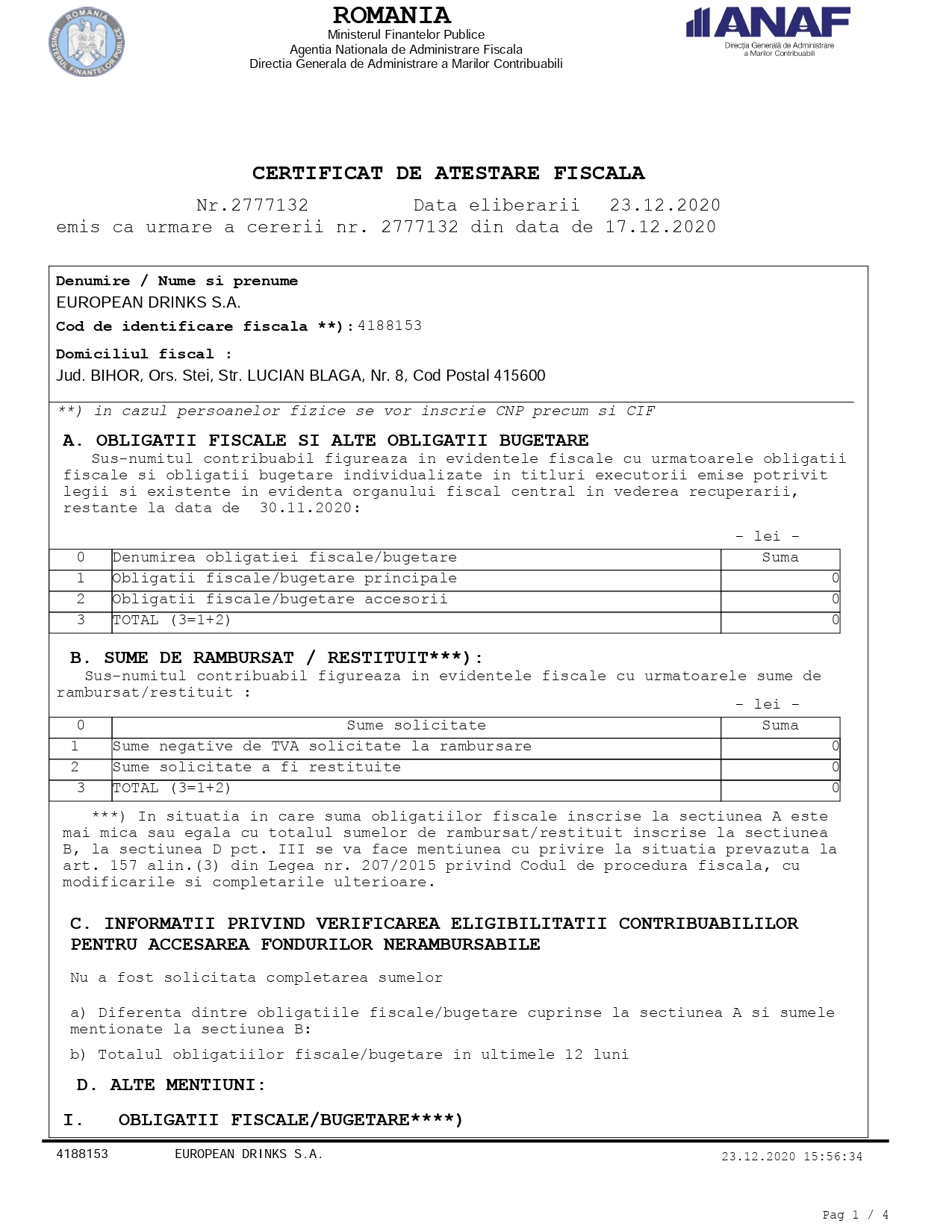 Conform certificatelor emise de Ministerul Finanţelor, European Food&Drinks nu înregistrează obligaţii fiscale restante. Astfel, în situaţia în care pandemia a produs o creştere generală a costurilor de aprovizionare, logistică şi a duratei medii de încasare a facturilor, Grupul Transilvania General Import-Export a reuşit să sprijine autoritățile statului în această perioadă dificilă, când cheltuielile de la bugetul de stat sunt semnificative.