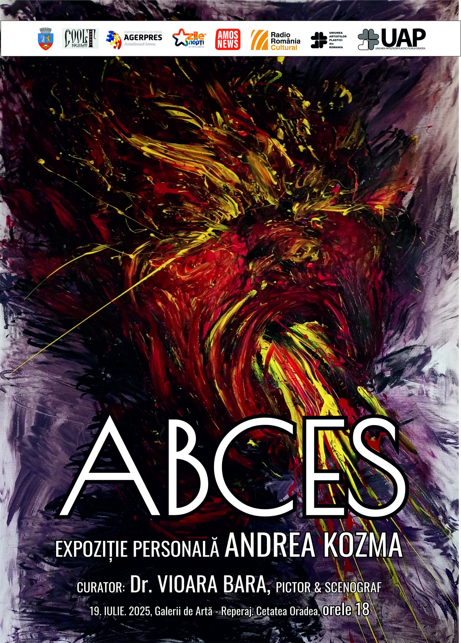 Uniunea Artiștilor Plastici din România, Filiala Oradea, a deschis Expoziția personală, pictură-sculptură „Abces” a artistei Andrea Kozma, la Galerii de Artă-Reperaj Cetate Oradea. Expoziţia este curatoriată de Vioara Bara, pictor şi scenograf.