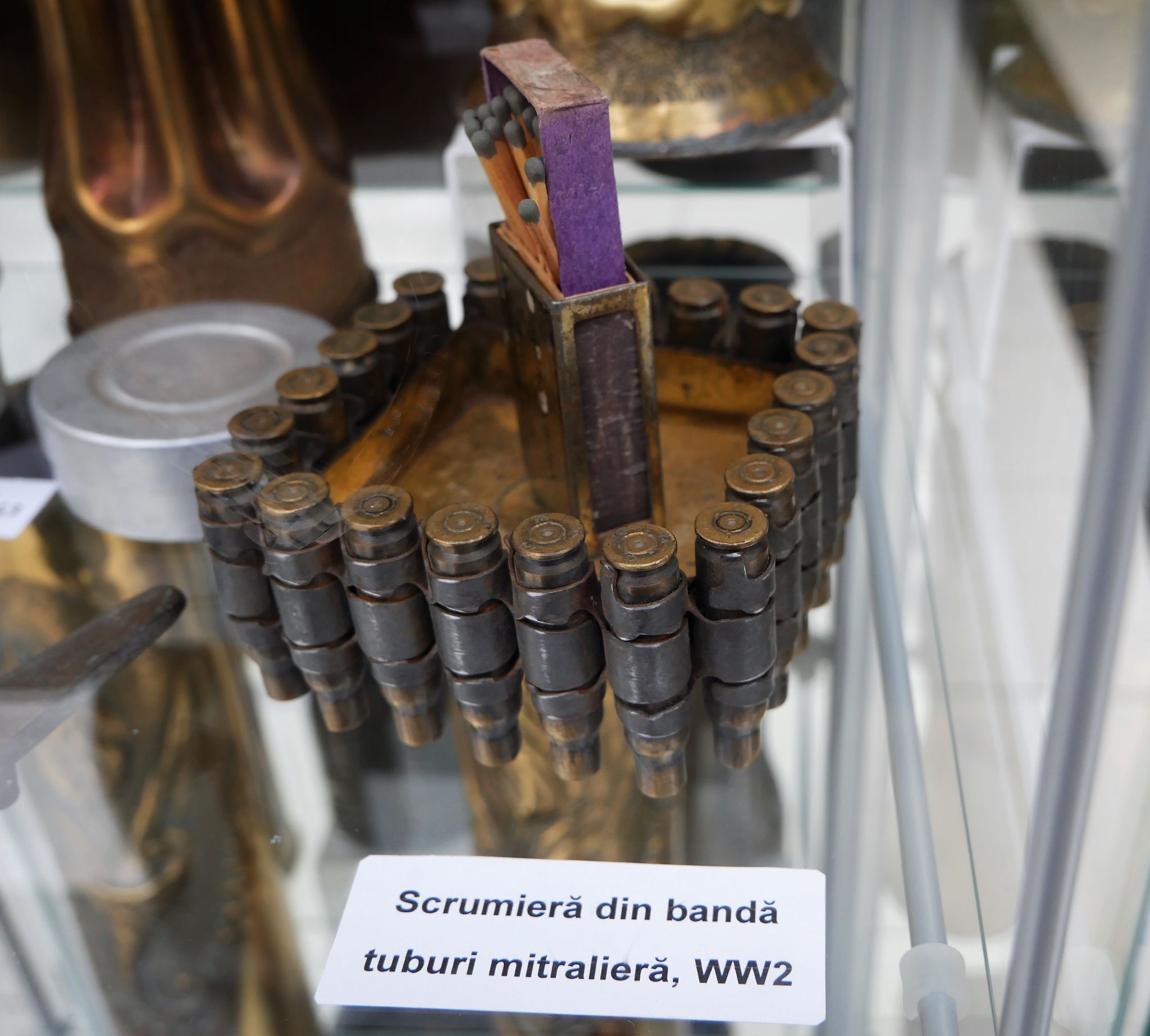 Organizatorii îi sfătuiesc pe vizitatori să nu rateze vaza ornamentată realizată din tub de proiectil de tun oferită soției mareșalului Constantin Prezan de generalul Philippe Henri Joseph ďAnselme, comandantul armatei franceze din Orient. De remarcat este, între altele, și o scrumieră de lut inscripționată cu Regimentul 18 Infanterie Gorj din care a făcut parte și Ecaterina Teodoroiu, dar și o scrumieră realizată din țeavă de tun. Alte obiecte care atrag atenția în expoziție sunt diferite scrumiere realizate din cartușe, grenade, proiectile, bidoane și gamele aparținând soldaților germani, busole, mască de gaze, cască aparținând tanchiștilor din URSS, cască aparținând soldaților americani, lanterne și lămpașuri din primul și al doilea război mondial, etc.