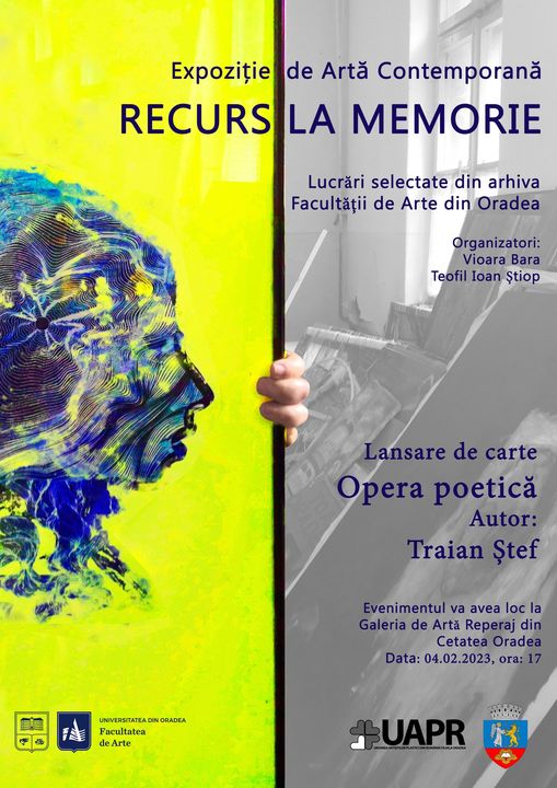 Uniunea Artiștilor Plastici, Filiala Oradea, în parteneriat cu Universitatea din Oradea – Facultatea de Arte, organizează Expoziția de Artă Contemporană „Recurs la memorie”. În premieră, pe simezele Galeriei de Artă „Reperaj” vor fi expuse lucrări selectate din arhiva Facultății de Arte Oradea.