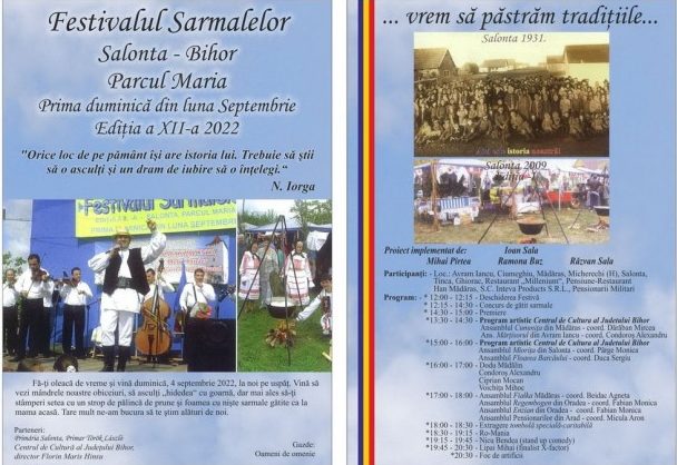 „Veniți la noi pe uspăț” e invitația lansată de Ioan Sala şi grupul „Oameni de omenie”, în parteneriat cu municipalitatea salontana și Centrul de Cultura al județului Bihor. Conform organizatorilor, primării, restaurante, întreprinderi din Salonta şi împrejurimi își dau întâlnire în prima duminica din septembrie în parcul Maria al Municipiului Salonta pentru a găti împreună peste 16.000 de sarmale.10 echipe de gătit, care vor fi premiate cu diplome şi medalii. Sarmale, fripturi, băuturi, dulciuri și deliciosul kurtos kalacs se află în meniu.