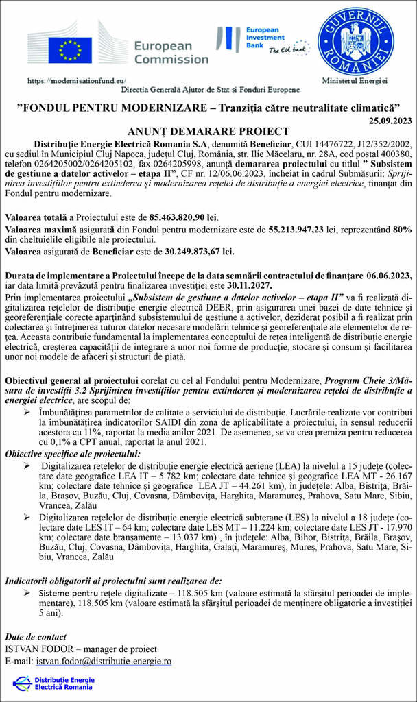Distribuție Energie Electrică Romania S.A, denumită Beneficiar, CUI 14476722, J12/352/2002, cu sediul în Municipiul Cluj Napoca, județul Cluj, România, str. Ilie Măcelaru, nr. 28A, cod postal 400380, telefon 0264205002/0264205102, fax 0264205998, anunță demararea proiectului cu titlul ” Subsistem de gestiune a datelor activelor – etapa II”, CF nr. 12/06.06.2023, încheiat în cadrul Submăsurii: Sprijinirea investițiilor pentru extinderea și modernizarea rețelei de distribuție a energiei electrice, finanțat din Fondul pentru modernizare.