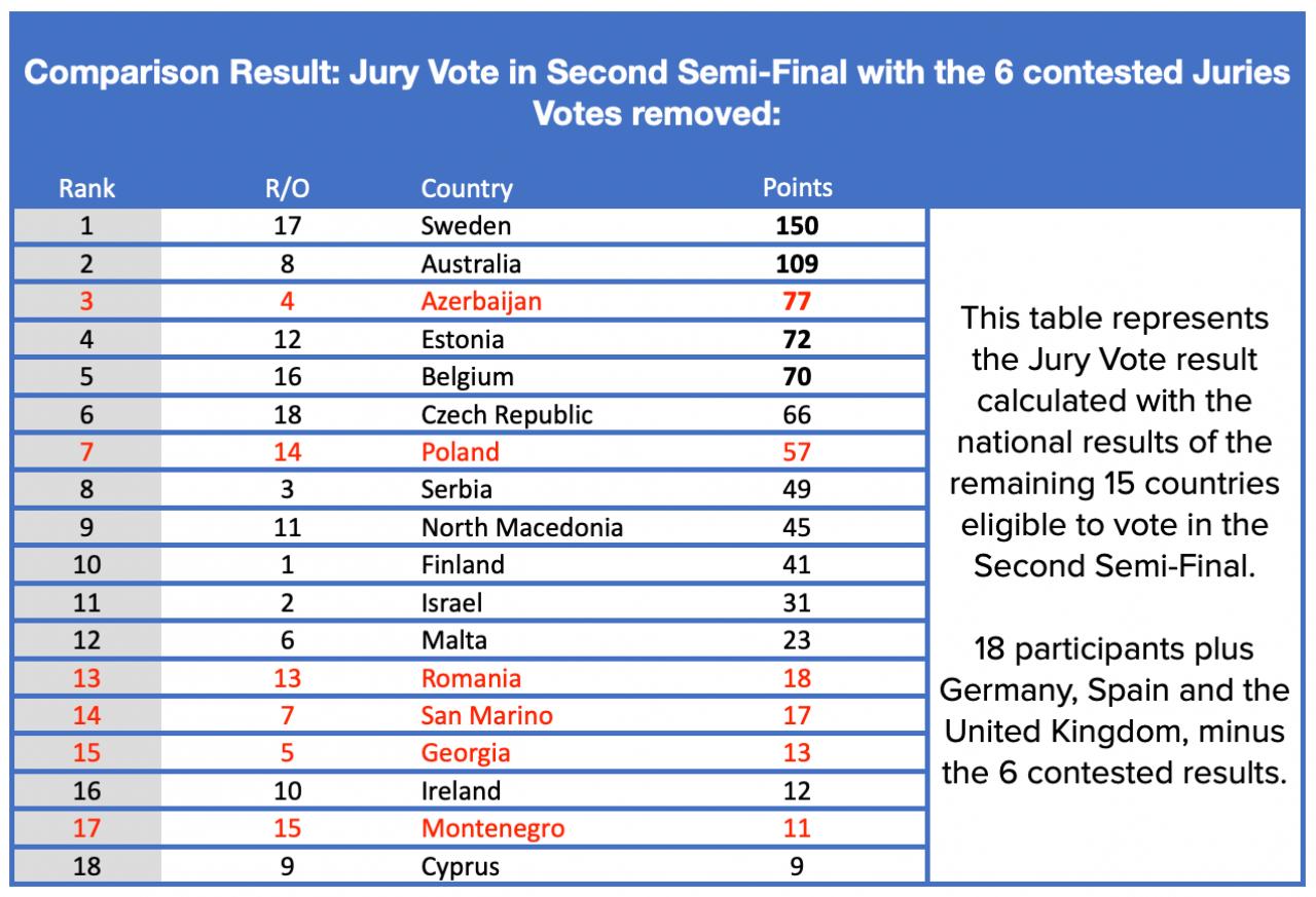 “Având în vedere natura fără precedent a neregulilor detectate în cea de-a doua semifinală, EBU, în consultare cu Partenerul de Votare paneuropean și Monitorul Independent de Votare, a decis, în conformitate cu Instrucțiunile de Vot ale Concursului, să își exercite dreptul de a elimina voturile. emise de cele șase jurii în cauză din alocarea clasamentului în Marea Finală pentru a păstra integritatea sistemului de vot. În consecință, a fost urmată aceeași procedură și rezultatul agregat de înlocuire calculat automat a fost utilizat pentru a determina rezultatele finale ale juriului din cele șase țări implicate, în Marea Finală”, se mai arată în comunicatul EBU.