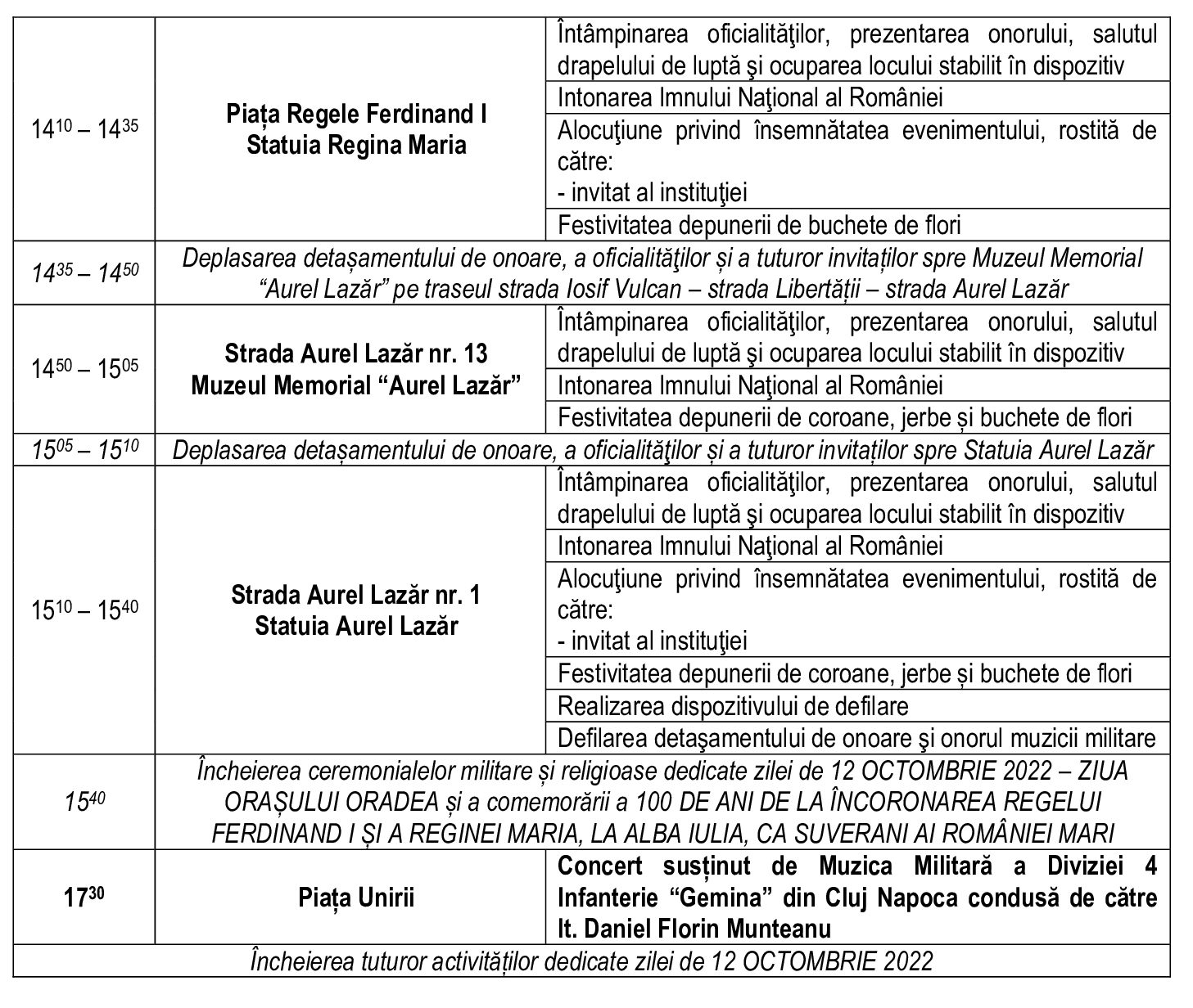 Ca element de noutate, miercuri, 12 octombrie, la Statuia Regelui Ferdinand I din Piața Unirii se va realiza din oră în oră schimbul militarilor din gardă, în intervalul orar 9:00 – 15:00, moment prin care se comemorează împlinirea a 100 de ani de la încoronarea Regelui Ferdinand I și a Reginei Maria (15 octombrie 1922), la Alba Iulia, ca Suverani ai României Mari.