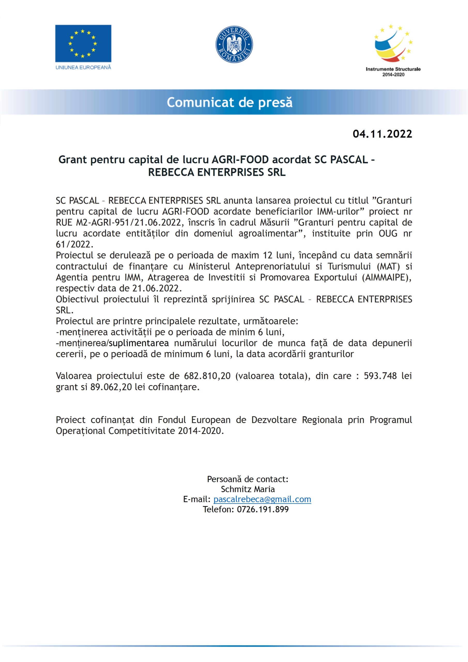 SC PASCAL – REBECCA ENTERPRISES SRL anunță lansarea proiectul cu titlul „Granturi pentru capital de lucru AGRI-FOOD acordate beneficiarilor IMM-urilor” proiect nr RUE M2-AGRI-951/21.06.2022, înscris în cadrul Măsurii „Granturi pentru capital de lucru acordate entităților din domeniul agroalimentar”, instituite prin OUG nr 61/2022.