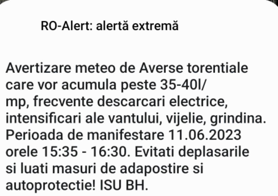 „Acesta este cel de-al doilea mesaj de avertizare prin sistemul RO-ALERT, din cursul zilei de azi, primul fiind trimis, pentru populația din localitățile Beiuș, Tinca, Dobrești, Ceica, Holod, Pomezeu, Cociuba Mare, Șoimi, Remetea, Lăzăreni, Roșia, Uileacu de Beiuș, Răbăgani, Husasău de Tinca, Căbești, Căpâlna, Pocola și Sâmbăta, care s-au aflat sub incidența Codului portocaliu, până la ora 15:30.