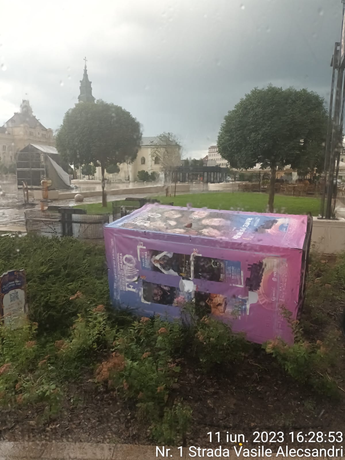 UPDATE: Câteva reprize de ploaie torențială au măturat centrul Oradiei, duminică, în jurul orei 16:00. Aversele au adus și grindină și vânt puternic. Un panou publicitar din Piața Unirii a fost luat pe sus și târât în scuarurile din centru.