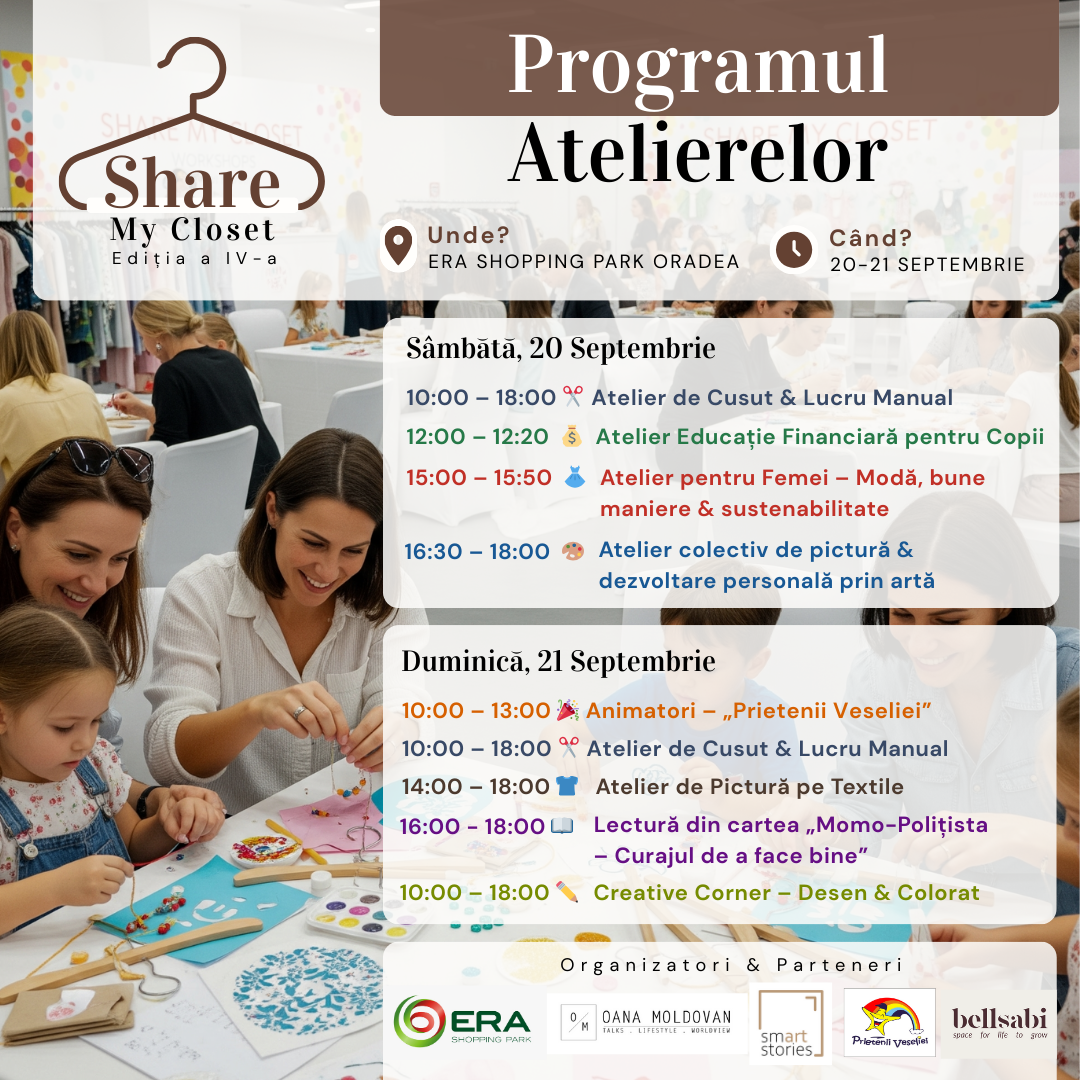 Pe 20 și 21 septembrie, la ERA Shopping Park Oradea, te invităm la Share My Closet – ediția a IV-a, un eveniment care aduce împreună comunitatea orădeană pentru creativitate, conectare și bucurie.