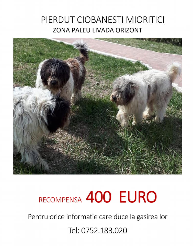 Oricine poate oferi informații pentru găsirea celor trei câini este rugat să-l contacteze pe proprietarul acestora, la numărul de telefon 0752.183. 020. Pentru găsirea patrupedelor se oferă o recompensă de 400 euro.