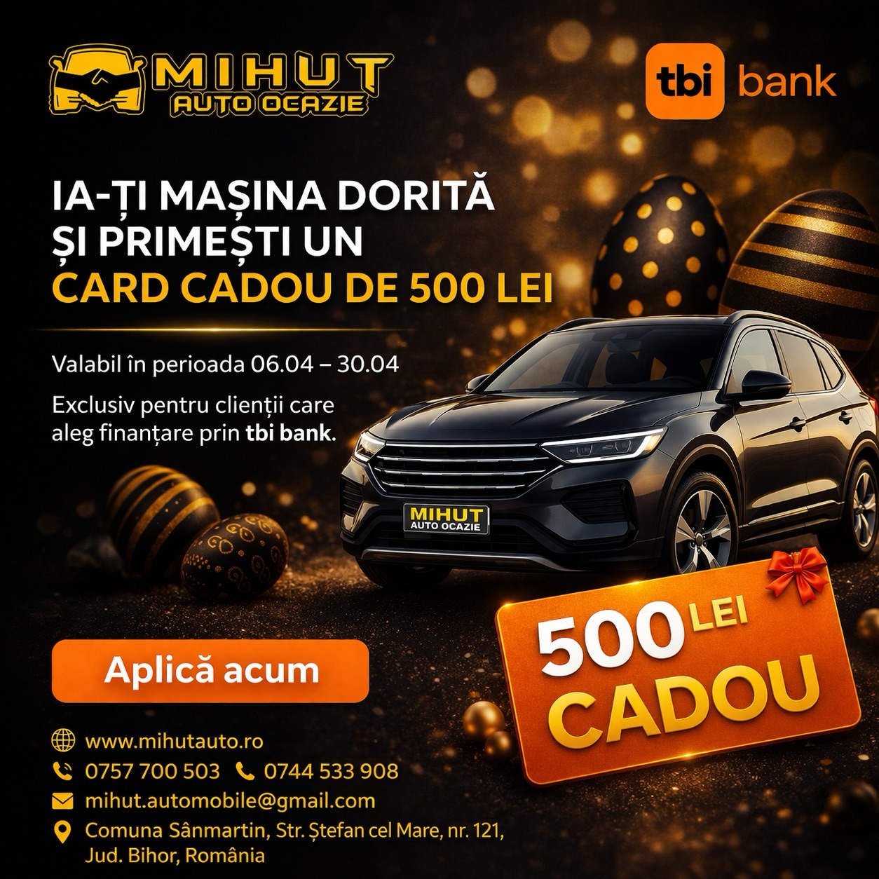Dacă veniţi la Mihuţ Automobile până în 30 aprilie şi vă găsiţi maşina dorită, veţi putea beneficia de un voucher cadou de 500 lei la Kaufland!