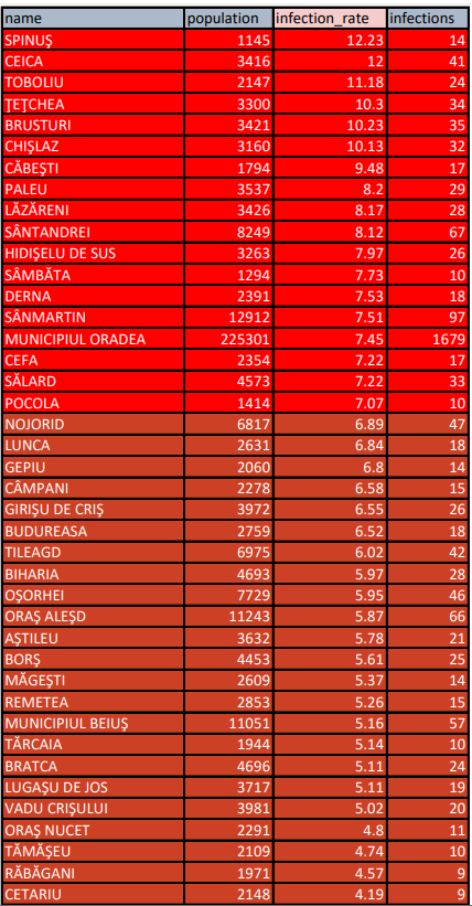 Incidența din Oradea a crescut din nou și a ajuns la 7,45 la mia de locuitori. Municipiul este la limita pragului 7,5‰, prag peste care sunt instituite restricții de circulație pe timp de noapte, în fiecare zi din săptămână. Moentan în Oradea sunt restricții de circulație doar în weekend, însă este de așteptat ca la următoarea ședință a Comitetului Județean pentru Situații de Urgență să fie instituite restricțiile în fiecare zi din săptămână.
