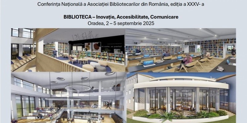Începe, la Oradea, Conferinţa Naţională a Asociaţiei Bibliotecarilor din România, ediţie aniversară Ediţia cu numărul XXXV va avea ca temă „Biblioteca – Inovaţie, Accesibilitate, Comunicare”. Cea de a XXXV-a ediţie a Conferinţei Naţionale a Asociaţiei Bibliotecarilor din România se va desfăşura la Oradea în perioada 2 – 5 septembrie. Organizată de Asociaţia Bibliotecarilor din România, în colaborare cu Biblioteca Universităţii din Oradea, Biblioteca Județeană „Gheorghe Șincai”, Casa Corpului Didactic Bihor, Inspectoratul Școlar Județean Bihor, Colegiul Economic „Partenie Cosma” Oradea, Colegiul Național „Samuil Vulcan” Beiuș şi partenerii acestora, conferinţa se va desfăşura având tema: „Biblioteca – Inovaţie, Accesibilitate, Comunicare”.