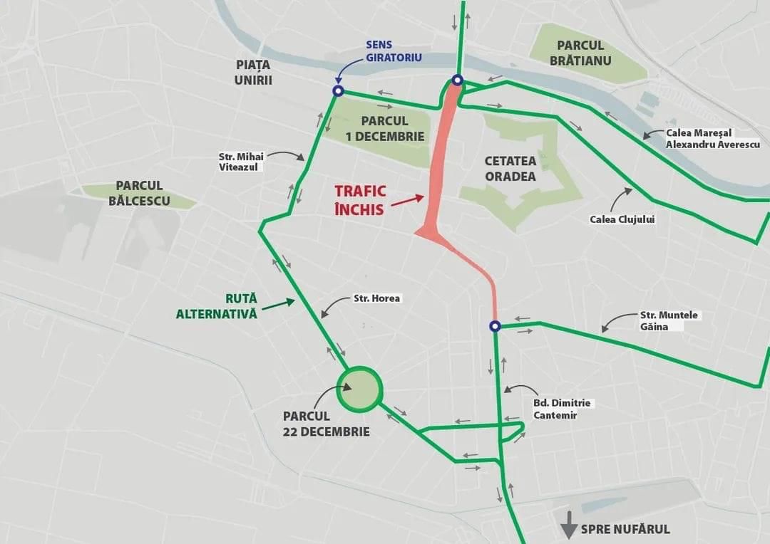 Traficul auto va fi închis pe bulevardul din Centrul Civic, între intersecția cu străzile Cicero și Arieșului și până la podul Dacia, în fața căruia se va amenaja un sens giratoriu. Din acest motiv, se va închide accesul dinspre bulevard către toate străzile adiacente: str. Gheorghe Costaforu, str. Evreilor Deportați, str. Mihail Kogălniceanu, str. Griviței și Piața 1 Decembrie.