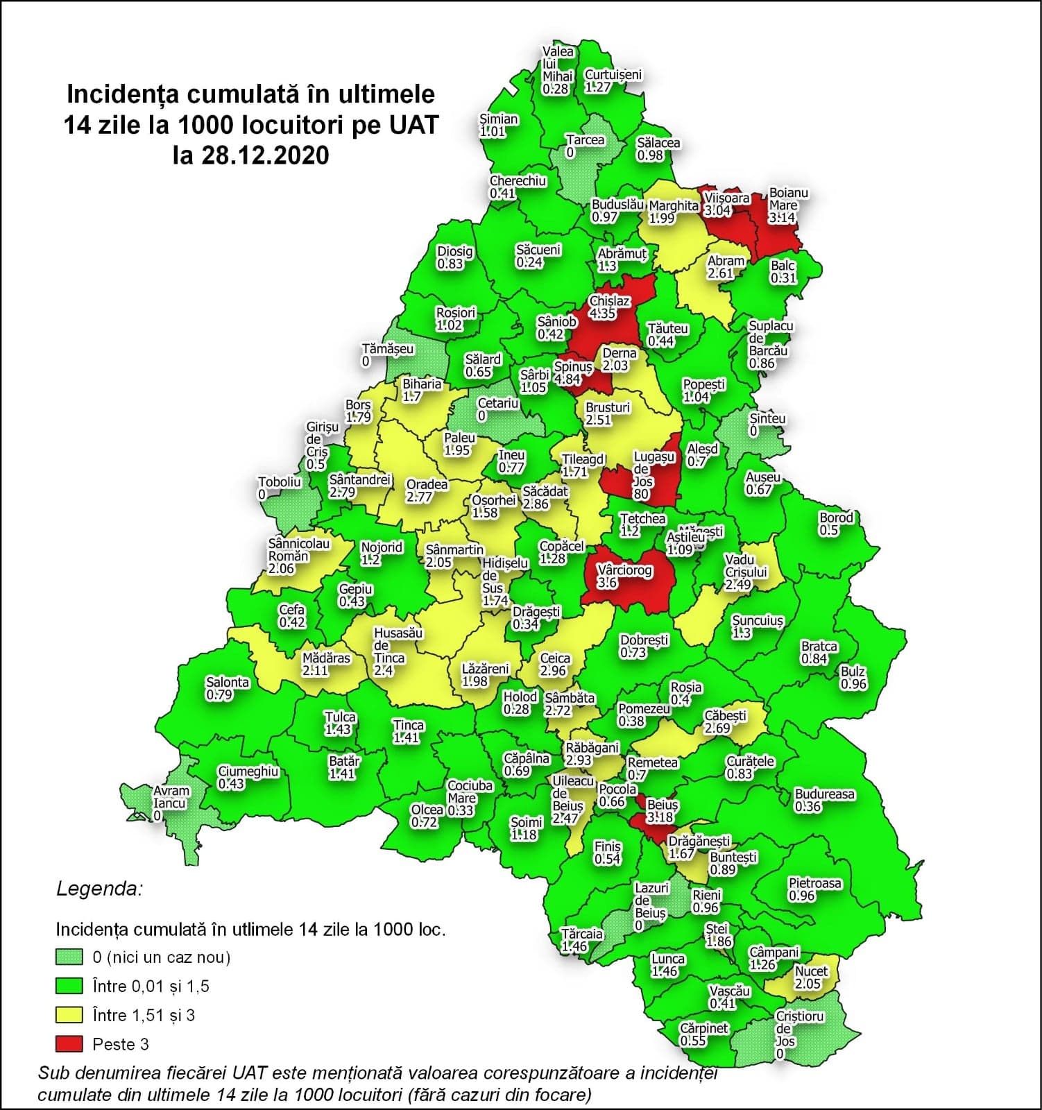 Cea mai mare rată de infectare din județul Bihor se înregistrează în Spinuș (4,84 la mia de locuitori) și Chișlaz (4,35 la mia de locuitori). În restul localităților incindeța este sub 4 la mie: Vârciorog (3,6 la mia de locuitori), Beiuș (3,18 la mia de locuitori), Boianu Mare (3,14 la mia de locuitori), Viișoara (3,04 la mia de locuitori) și Lugașu de Jos.