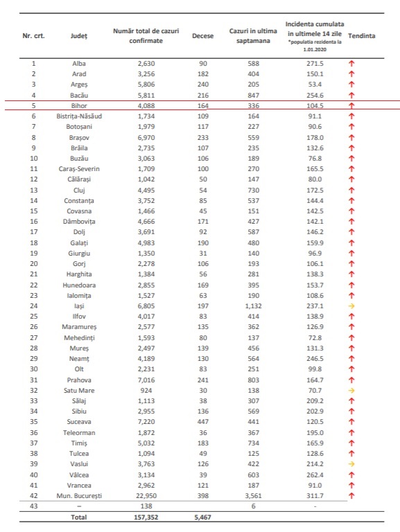 Potrivit datelor transmise de către INSP, în Bihor au fost confirmate de la începutul epidemiei de coronavirus și până în prezent 4.088 de cazuri de COVID-19. În ceea ce privește numărul deceselor, bilanțul deceselor de coronavirus din Bihor a ajuns la 164. În ultima sătpămână au fost confirmate 336 de noi infectări în Bihor, iar incidența cumulată în ultimele 14 zile este de 104,5, ceea ce ne duce județul pe un trend ascendent.
