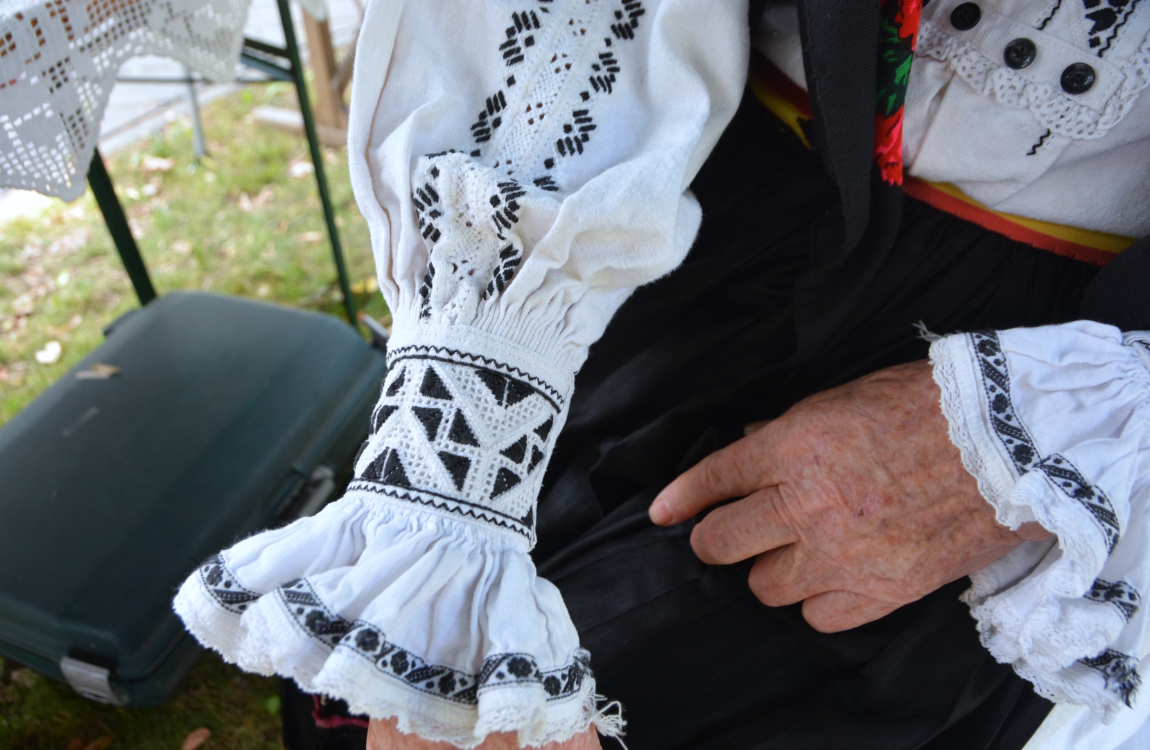 Floare Codoban: E foarte bine! Numai să înceapă să facă, să nu se piardă tradiţia. Chiar mă bucur, şi o mare plăcere aş avea dacă şi eu aş putea arăta la cine ar fi interesat să facă. Ale mele sunt numai lucruri tradiţionale. Eu numai din cânepă le-am făcut, nu am nimic din materiale de cumpărat. Ştiu lucra tot ce e pe ele, dar nu mai văd amu. Asta-i, că anii îs mulţi! 76! Îi mult să-i numeri, da’ să îi şi trăieşti şi cu bune, şi cu rele! Tăieturile ce le am pe poale (n.r. – fustă), toate le-am ştiut face când am fost mai tânără, când am văzut bine şi stăteam la vaci şi coseam. Scad şi puterile! Astea de pe mine toate-s făcute cu lucru de mână, original, după cum îi tradiţia.