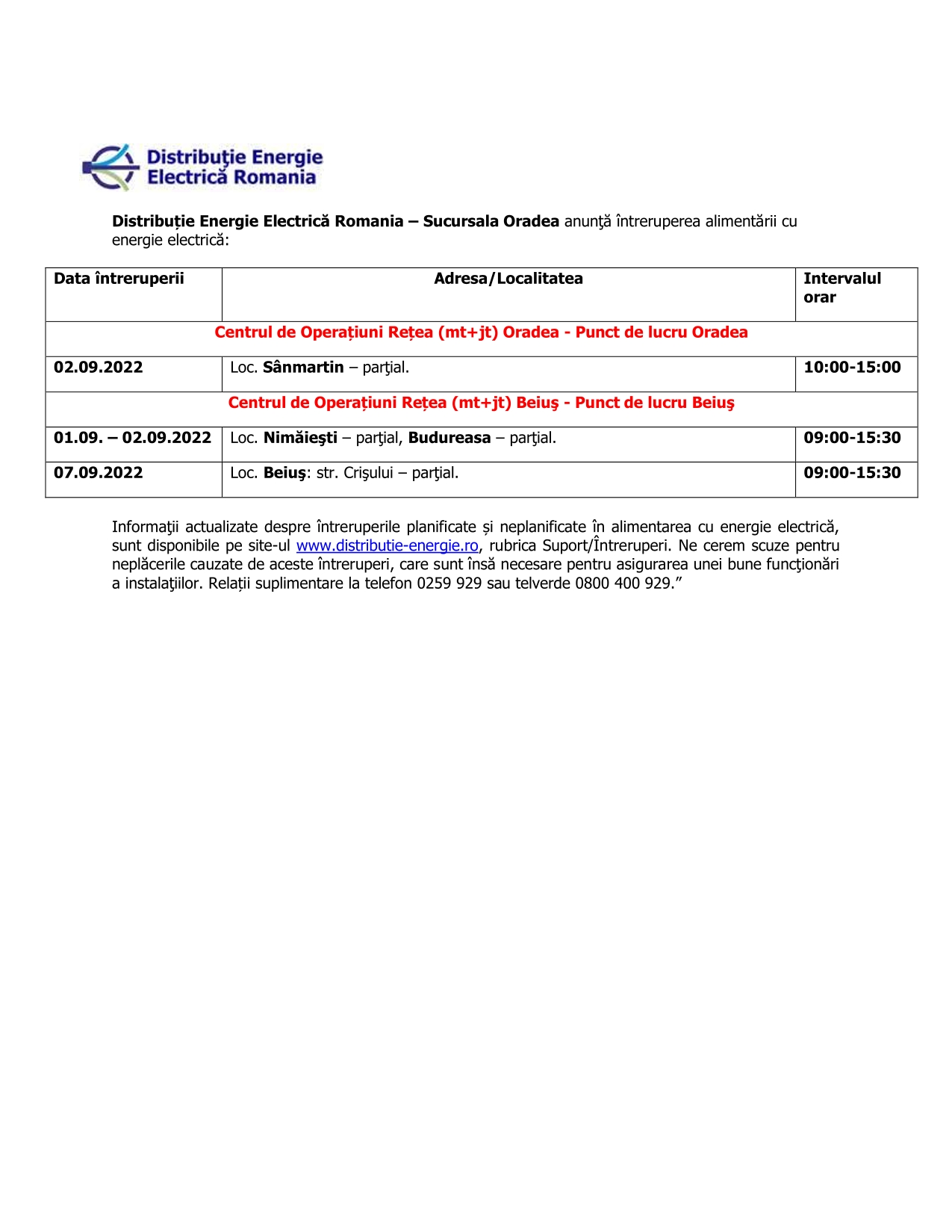 ÎNTRERUPERI ENERGIE ELECTRICĂ -Perioada 01.09.2022 - 07.09.2022_PL Oradea + PL Beius
