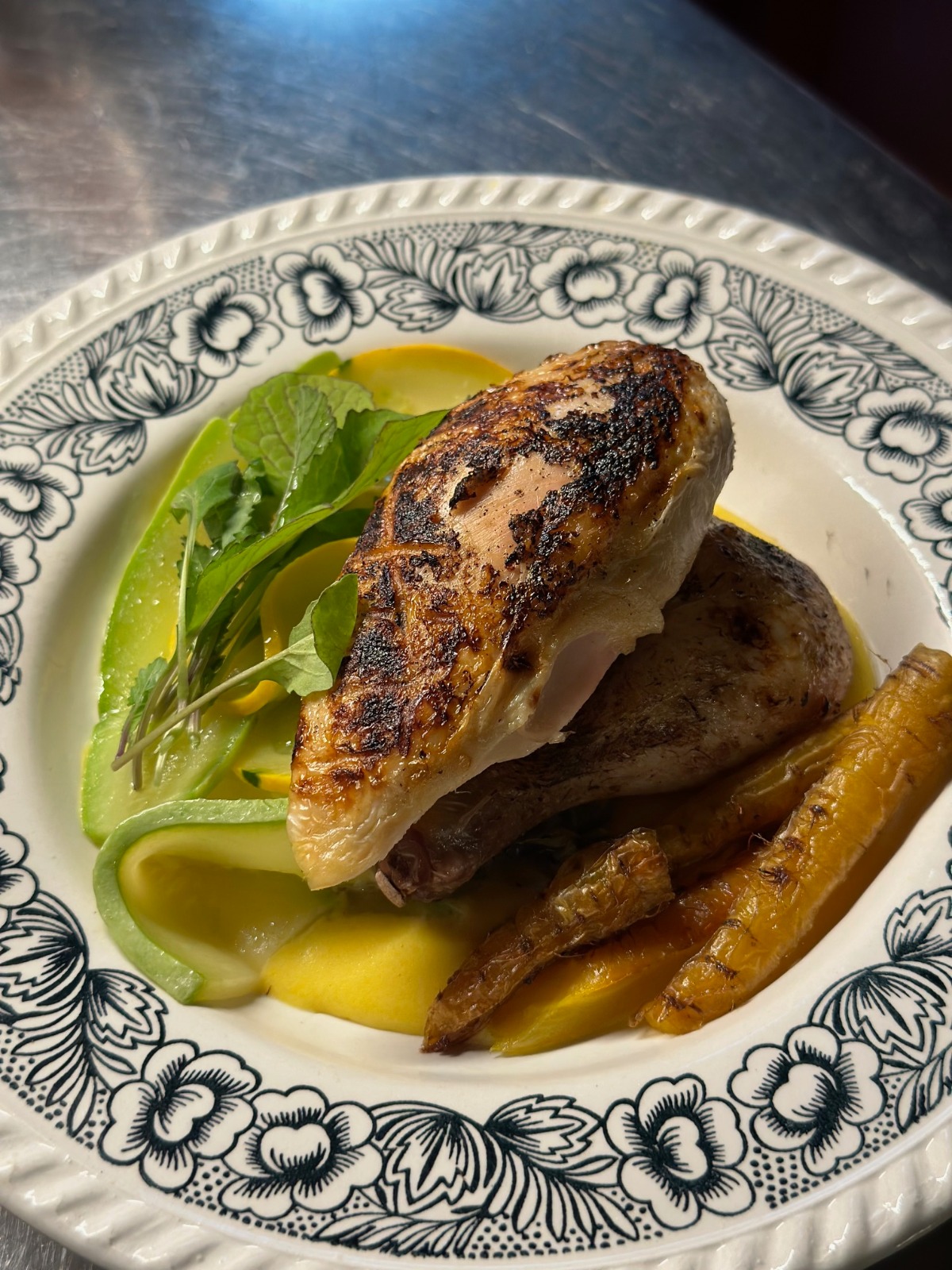 • coquelet, cartofi noi îmbrăcați în salsa verde și dovlecei
