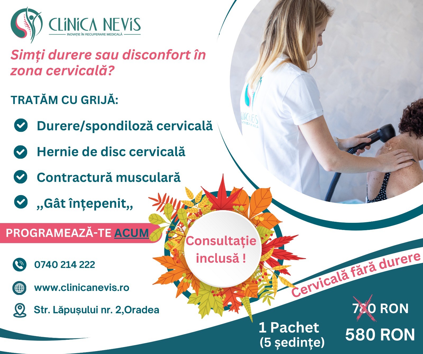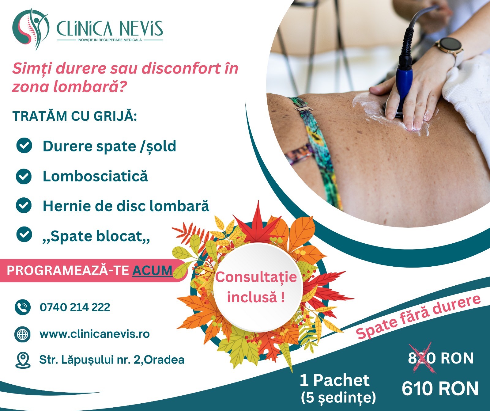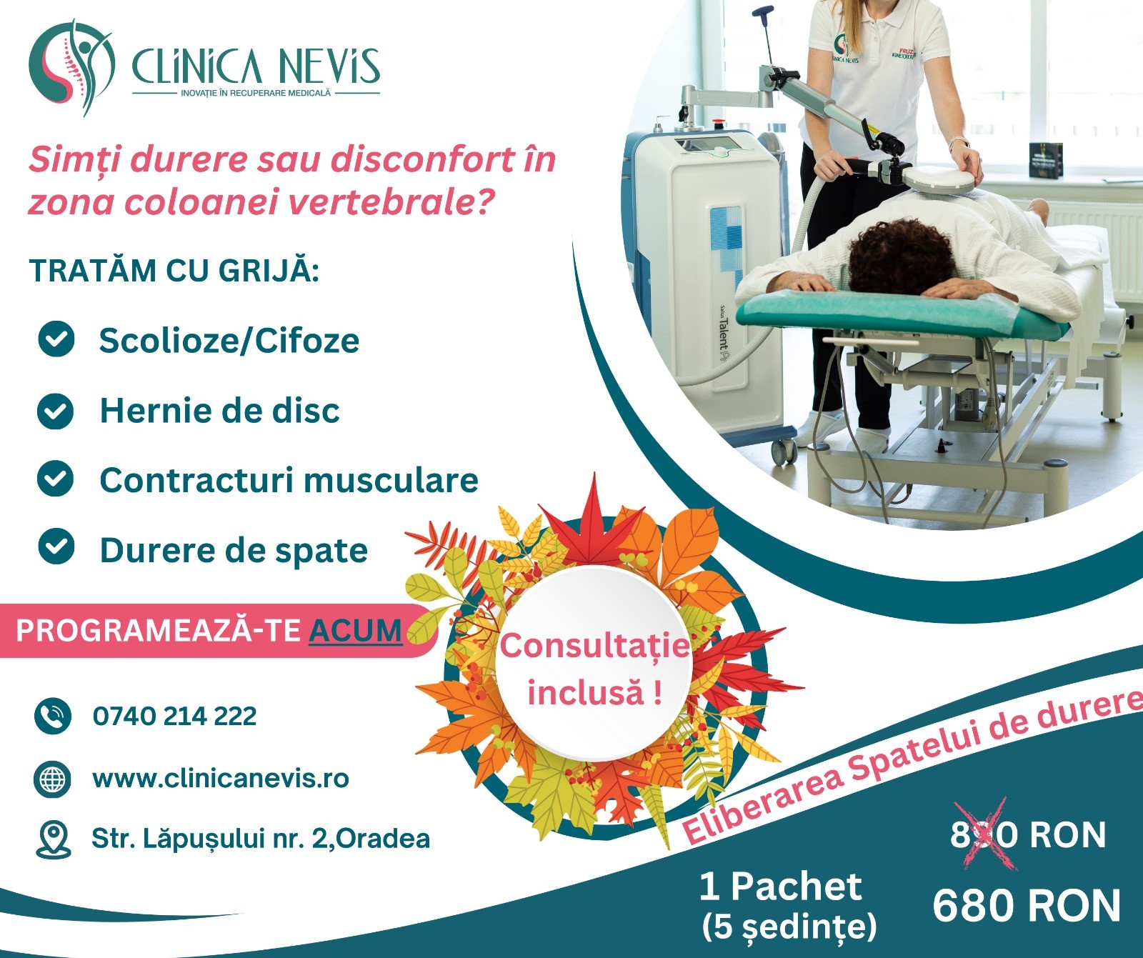 Telefon: 0740 214 222. Pentru mai multe detalii, vizitați pagina noastră de Facebook Clinica Nevis sau Instagram: clinicanevis sau site-ul oficial www.clinicanevis.ro