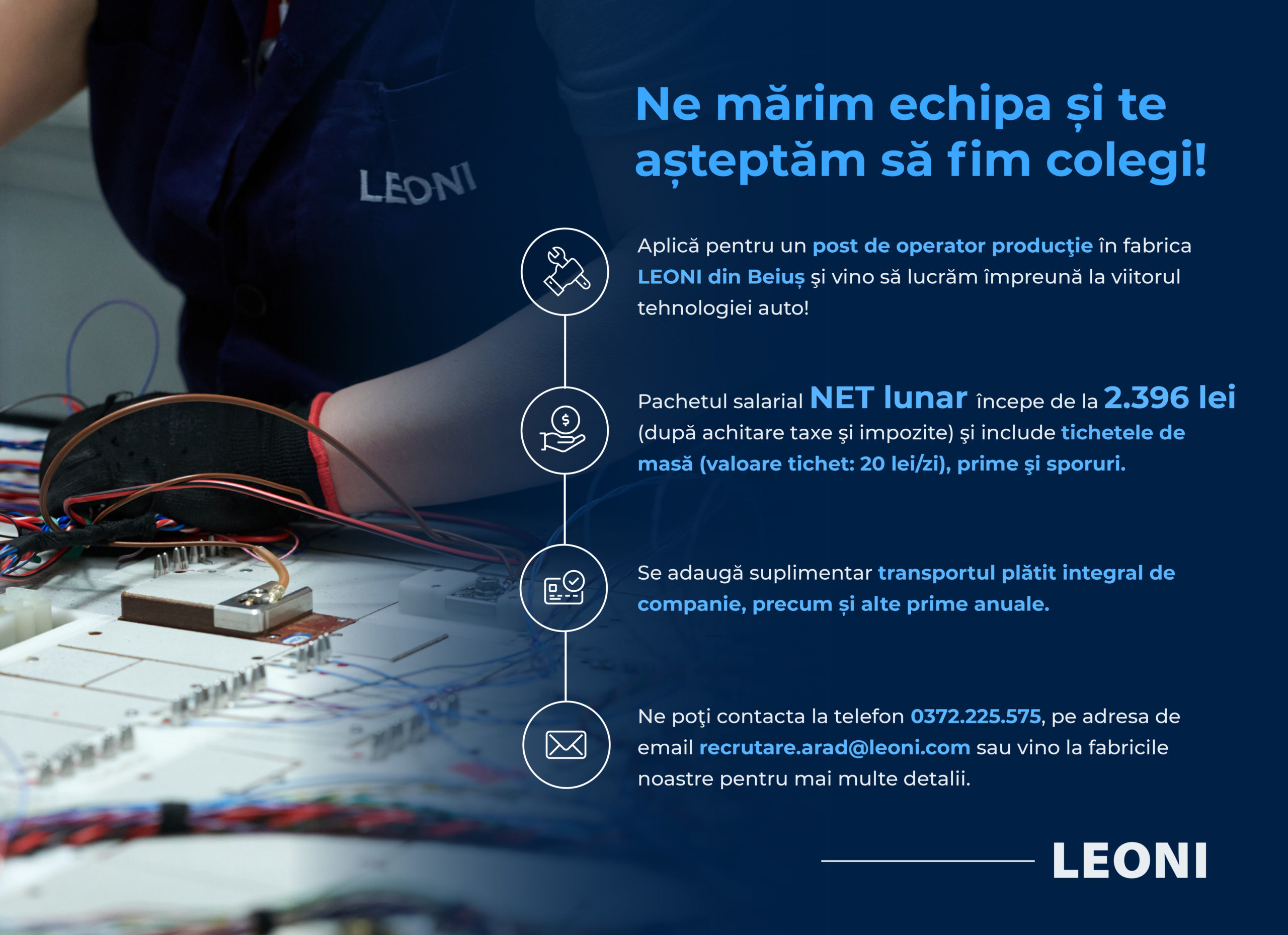 Ne poți contacta la telefon 0372.225.575, pe adresa de email recrutare.arad@leoni.com sau vino la fabricile noastre pentru mai multe detalii.