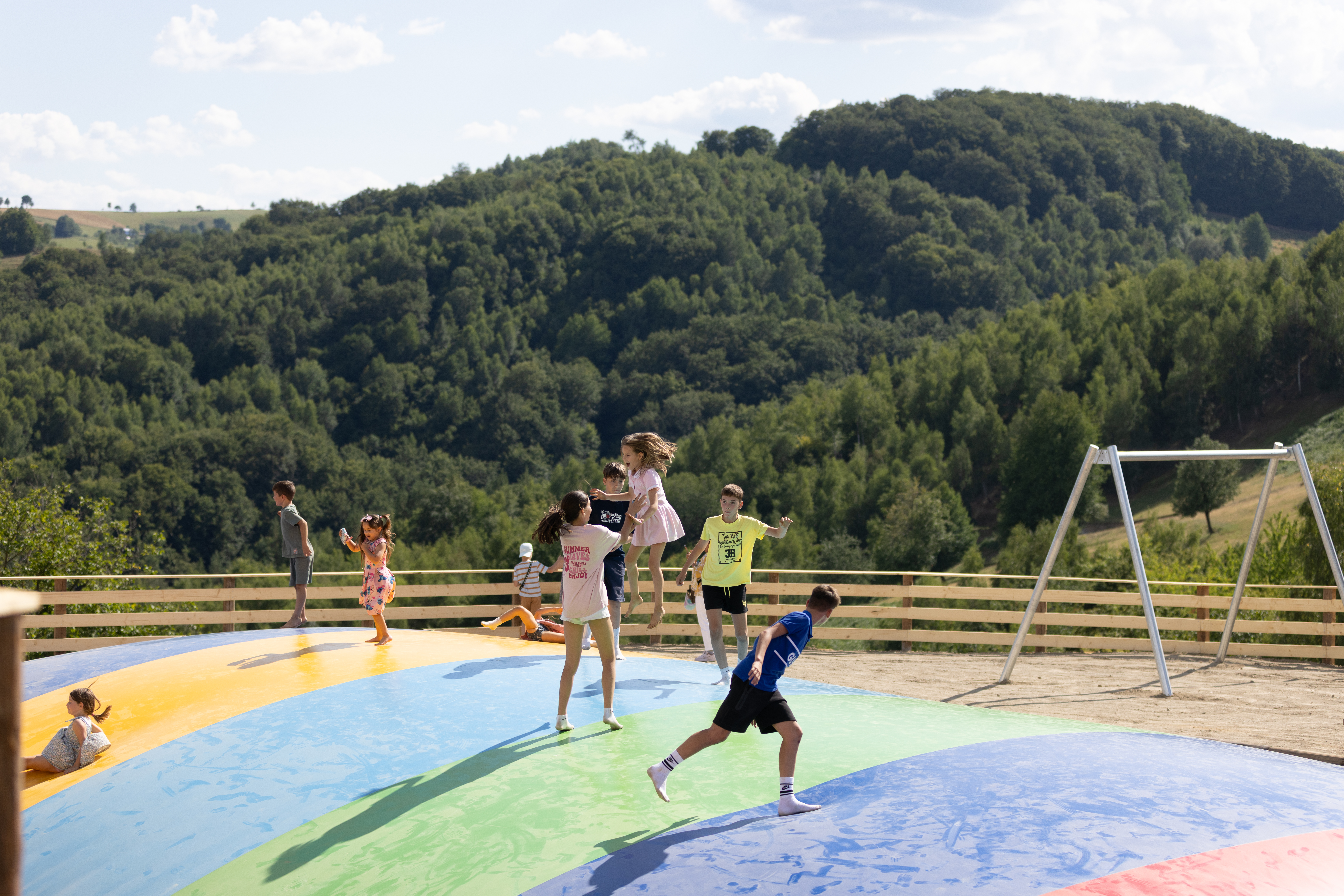 Locul de joaca pentru copii cu un castel, trambuline, tobogane și animale mici pt copii!