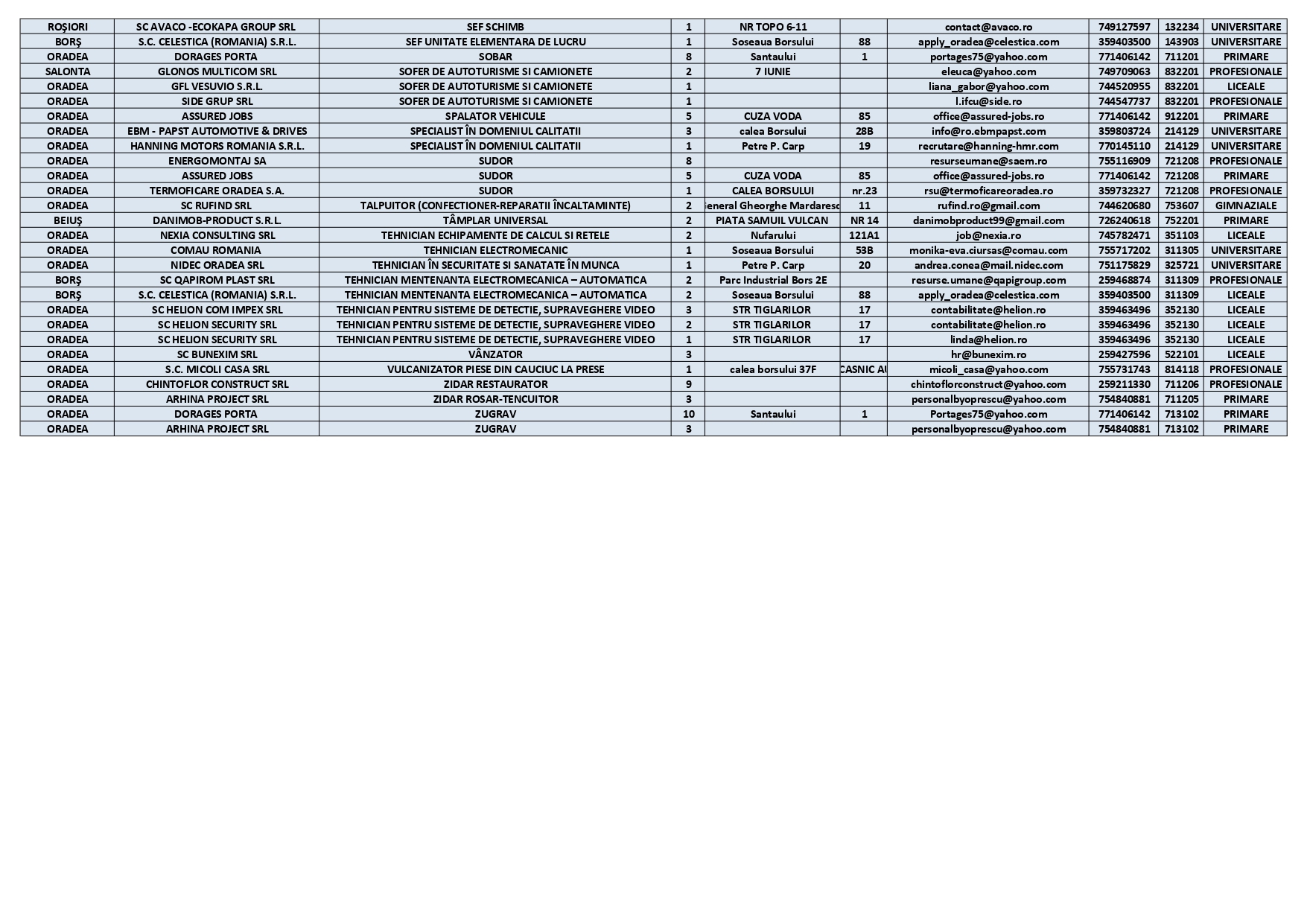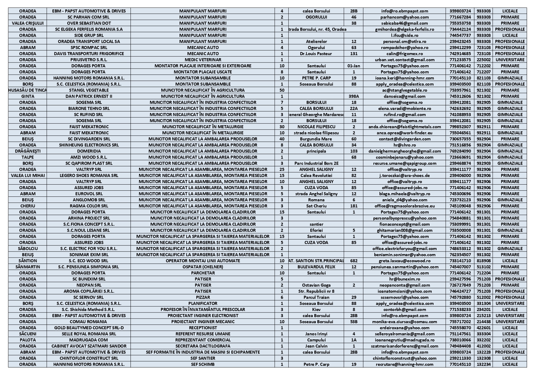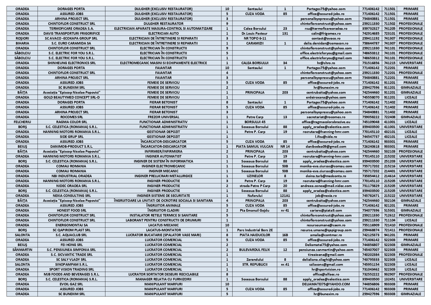 De asemenea, sunt 91 de posturi pentru persoanele care au doar studii primare sau gimnaziale, între care: agent de securitate, ajutor bucătar, ambalator manual, brutar, călcătoreasă lenjerie, cusător piese din piele, femeie de serviciu, frezor universal, manipulant mărfuri, muncitor necalificat sau tălpuitor, ajutor ospătar, contabil, dulgher, faianțar sau spălător vehicule.