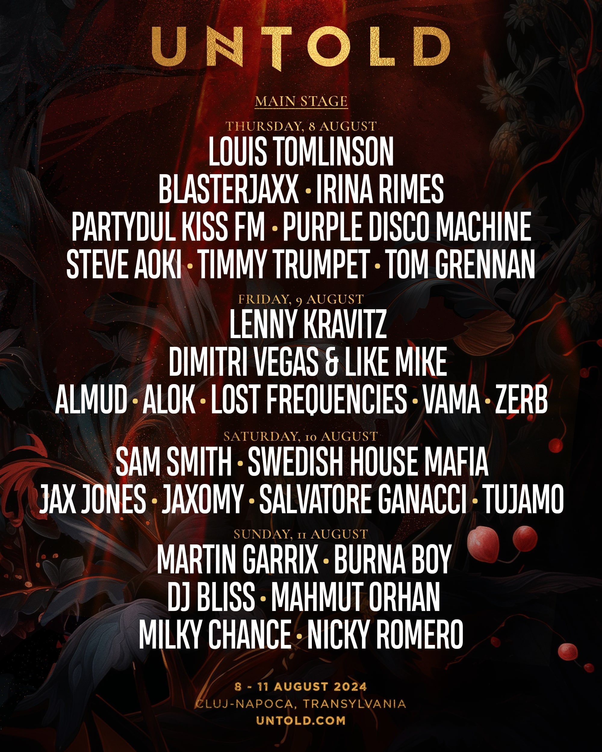 Cei mai mari artiști și cei mai cunoscuți DJ din lume, nume în premieră pregătite de creatorii UNTOLD, vor transforma Cluj-Arena într-un paradis al muzicii. Cu o combinație uluitoare de genuri, artiștii de la Mainstage vor electriza atmosfera celor patru zile și patru nopți de festival: Lenny Kravitz, Sam Smith, Burna Boy, Louis Tomlinson, Tom Grennan, Milky Chance, Irina Rimes, Vama, Swedish House Mafia, Martin Garrix, Dimitri Vegas & Like Mike, Alok, Timmy Trumpet, Steve Aoki, Lost Frequencies, Purple Disco Machine, Salvatore Ganacci, Mahmut Orhan, Nicky Romero, Tujamo, Blasterjaxx, Jaxomi, Zerb, Jax Jones, DJ Bliss, Partydul Kiss FM, Almud.