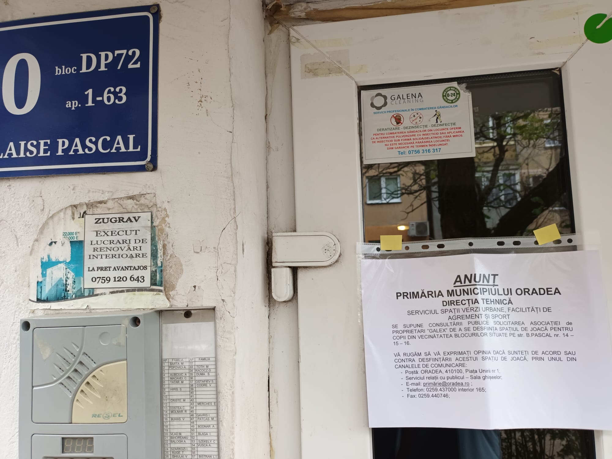 „Ținând cont de faptul că locul de joacă este de utilitate publică și în imediata vecinătate există alte șapte scări de bloc, Primăria Oradea a realizat o consultare publică în perioada 16.10.2023 – 11.12.2023. Astfel, s-au pus afișe la intrările în scările de bloc, solicitându-se locatarilor să-și exprime opinia. Blocurile vizate de consultarea publică au fost cele din str. M. Sadoveanu nr. 2 DP74; str. B. Pascal nr. 10 DP72 și nr. 20 DP82; str. Moldovei nr. 70 DP78; nr. 72 DP80; nr. 74 X89 și nr. 80 DP76. Având în vedere că, până la data de 12.12.2023, nu a fost înregistrat niciun punct de vedere cu privire la păstrarea/desființarea locului de joacă, în perioada următoare Primăria Oradea, prin Direcția Tehnică, va da curs solicitării de desființare a spațiului de joacă”, a anunțat Primăria Oradea.