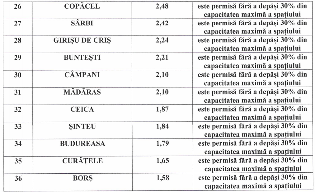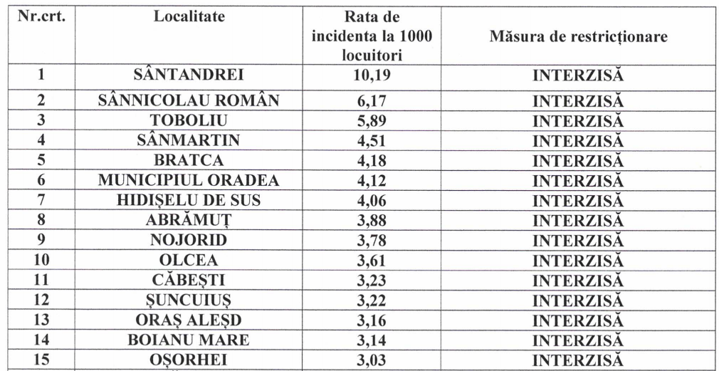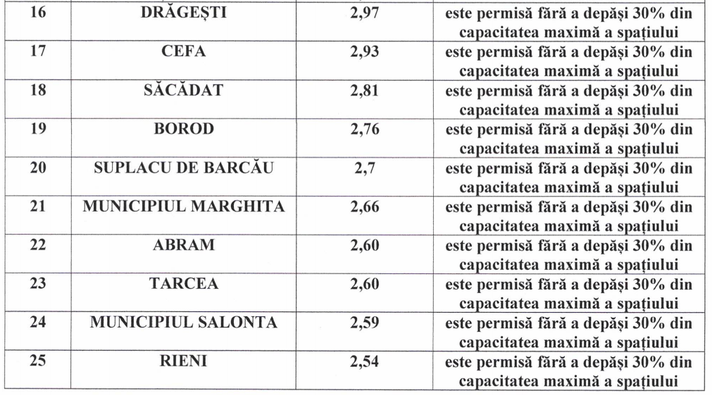 Localitățile în care incidența cumulată în ultimele 14 zile a cazurilor a fost mai mare de 1,5 și mai mică sau egală cu 3 cazuri/1.000 de locuitori sunt: Drăgești, Cefa, Săcădat, Borod, Suplacu de Barcău, Marghita, Abram, Tarcea, Salonta, Rieni, Copăcel, Sârbi, Girișu de Criș, Buntești, Câmpani, Mădăras, Ceica, Șinteu, Budureasa, Curățele și Borș. Din măsurile care se aplică în cele 21 de localități menționăm: