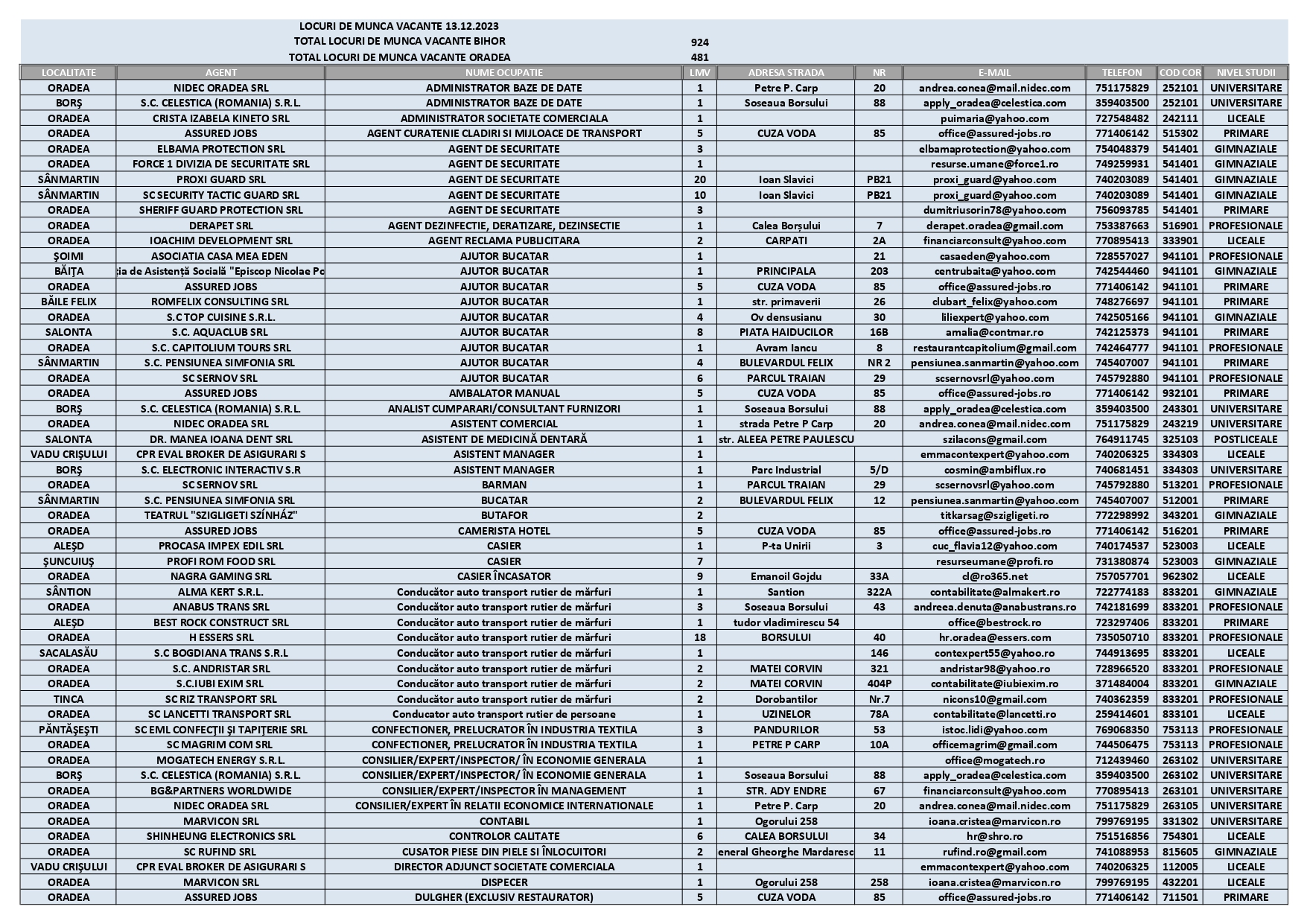 Mai multe detalii despre oferta de locuri de muncă a firmelor din Bihor pot fi obținute de la AJOFM Bihor, Oradea, Str. Transilvaniei nr. 14.