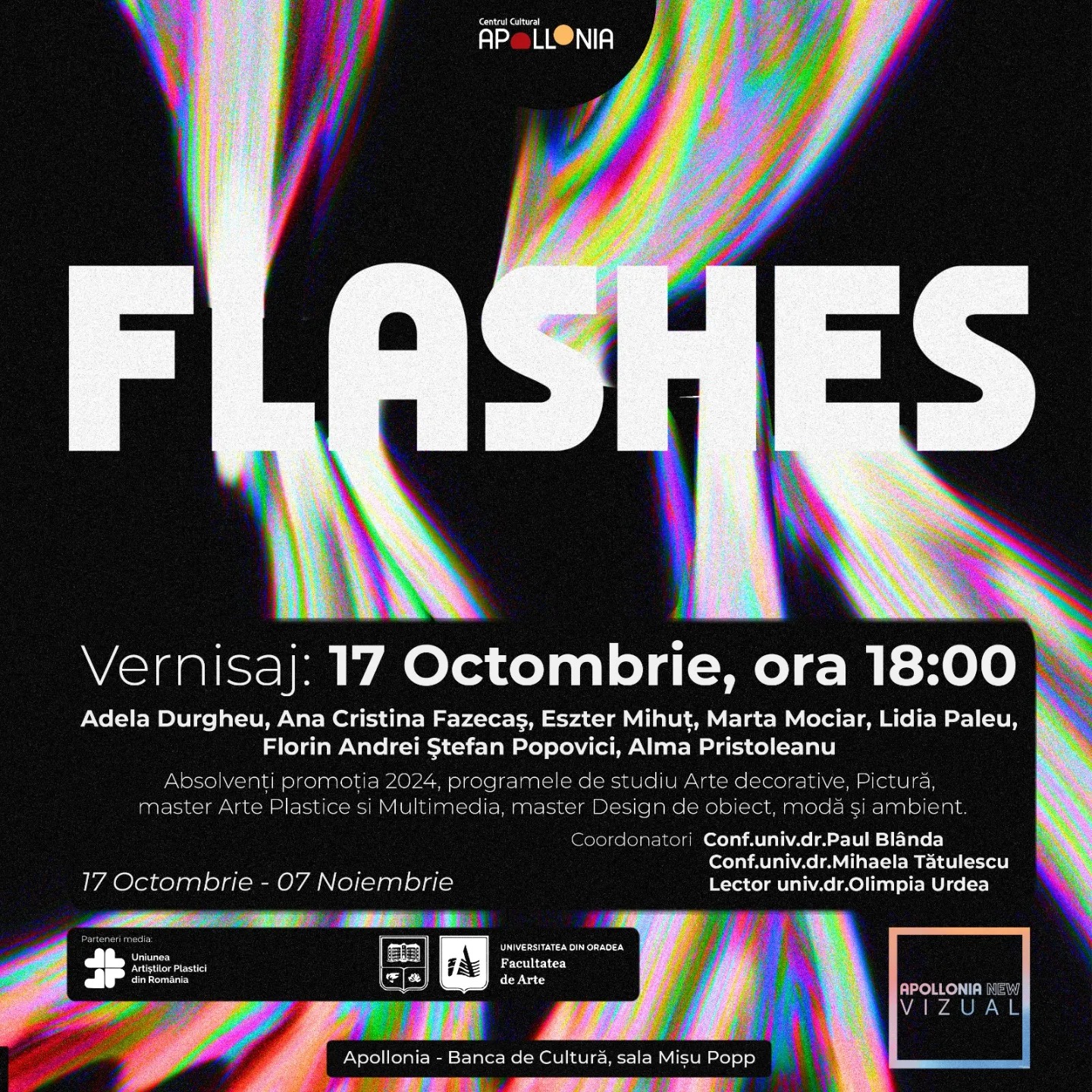 Expoziția „Flashes”, vernisată în sala Mișu Popp a Centrului Cultural Apollonia – Banca de Cultură, reprezintă debutul programului „Apollonia New – Vizual” şi deschide seria evenimentelor dedicate celor 30 ani de învąțământ universitar artistic la Oradea.