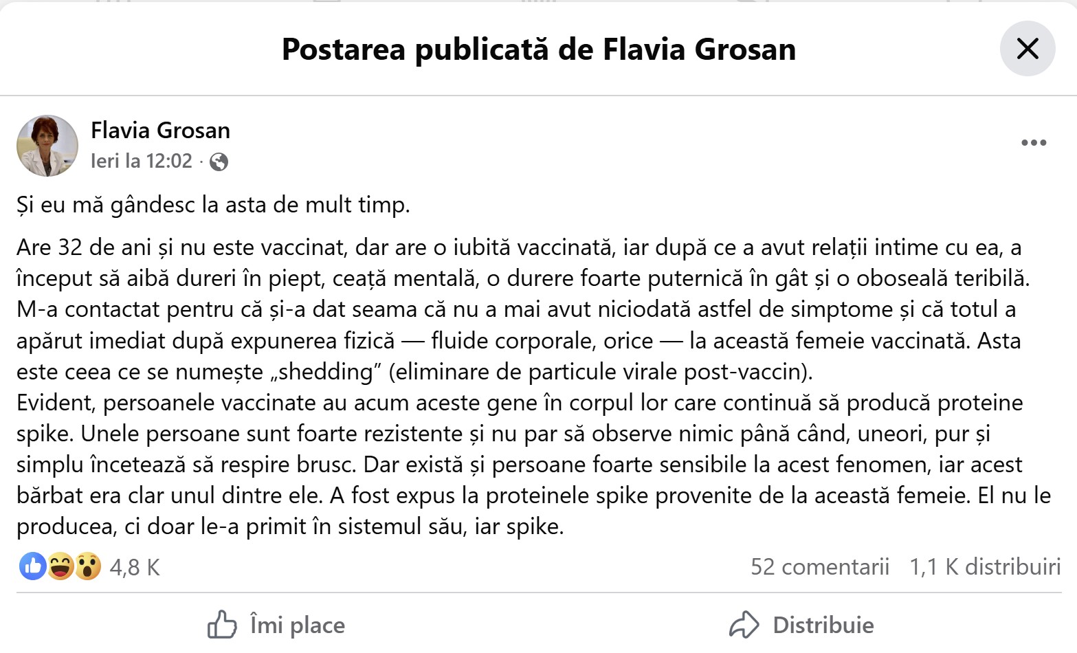 „Are 32 de ani și nu este vaccinat, dar are o iubită vaccinată, iar după ce a avut relații intime cu ea, a început să aibă dureri în piept, ceață mentală, o durere foarte puternică în gât și o oboseală teribilă. M-a contactat pentru că și-a dat seama că nu a mai avut niciodată astfel de simptome și că totul a apărut imediat după expunerea fizică — fluide corporale, orice — la această femeie vaccinată. Asta este ceea ce se numește „shedding” (eliminare de particule virale post-vaccin). Evident, persoanele vaccinate au acum aceste gene în corpul lor care continuă să producă proteine spike. Unele persoane sunt foarte rezistente și nu par să observe nimic până când, uneori, pur și simplu încetează să respire brusc. Dar există și persoane foarte sensibile la acest fenomen, iar acest bărbat era clar unul dintre ele. A fost expus la proteinele spike provenite de la această femeie. El nu le producea, ci doar le-a primit în sistemul său, iar spike.”, se arată în postarea Flaviei Groșan.