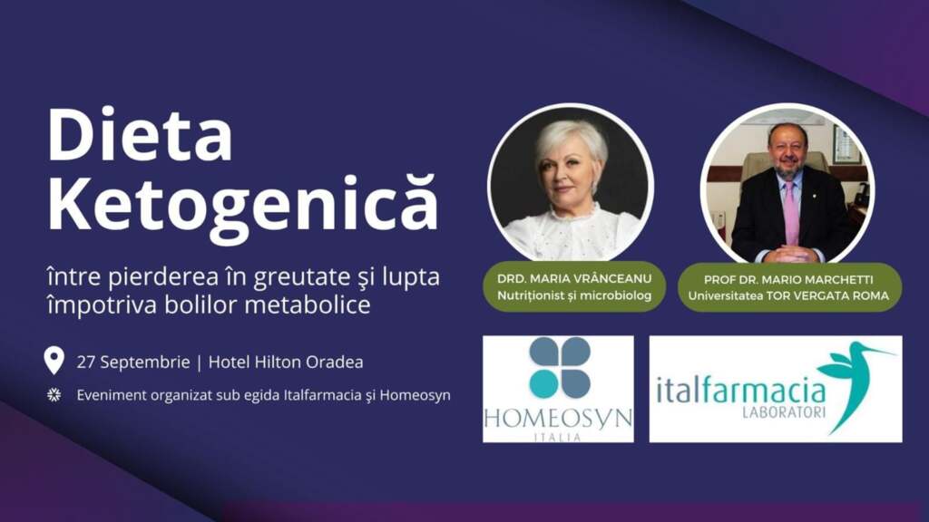 Împreună cu specialiștii, vom explora eficiența dietei keto în obezitate, relația sa cu fastingul și varianta modernă pentru pierderea în greutate. Vom discuta și PROTOCOLUL ITALFARMACIA AL DIETEI OLOPROTEICE SAU LIPOSUCȚIA ALIMENTARĂ, iar în cadrul evenimentului va avea loc o prezentare de produse Italfarmacia, pentru susținerea masei musculare în dietele de slăbire.