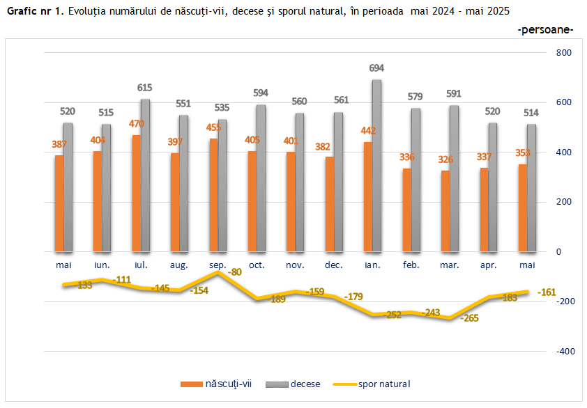 Ca urmare, sporul natural (diferența dintre numărul nou-născuților și al deceselor) a fost negativ, cifrându-se la -161 de persoane în mai 2025. Aceasta indică o descreștere naturală a populației județului, într-un context în care decesele depășesc nașterile. De remarcat este și numărul redus al decedaților sub un an, care a fost de doar un copil, în scădere cu 3 față de luna precedentă și cu 2 față de aceeași lună a anului 2024.