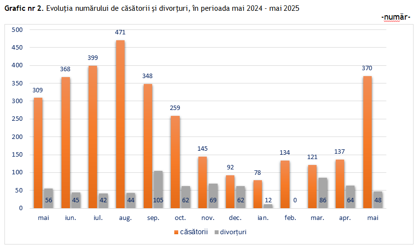 În schimb, numărul divorțurilor pronunțate de instanțele judecătorești a scăzut. În mai 2025 s-au înregistrat 48 de divorțuri, cu 16 mai puține față de luna precedentă și cu 8 mai puține comparativ cu mai 2024.